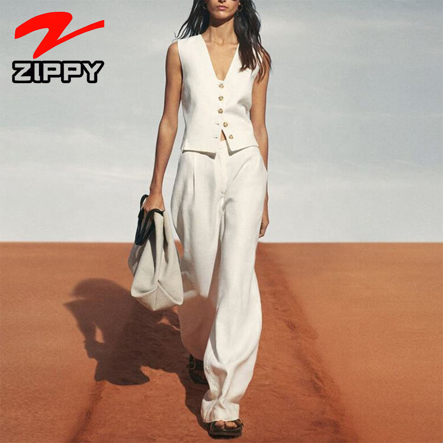 OEM ensemble de lin personnalisé femmes été jambe droite grande taille couleur unie costume pantalon haut sans manches ensembles de lin pour les femmes 2 pièces