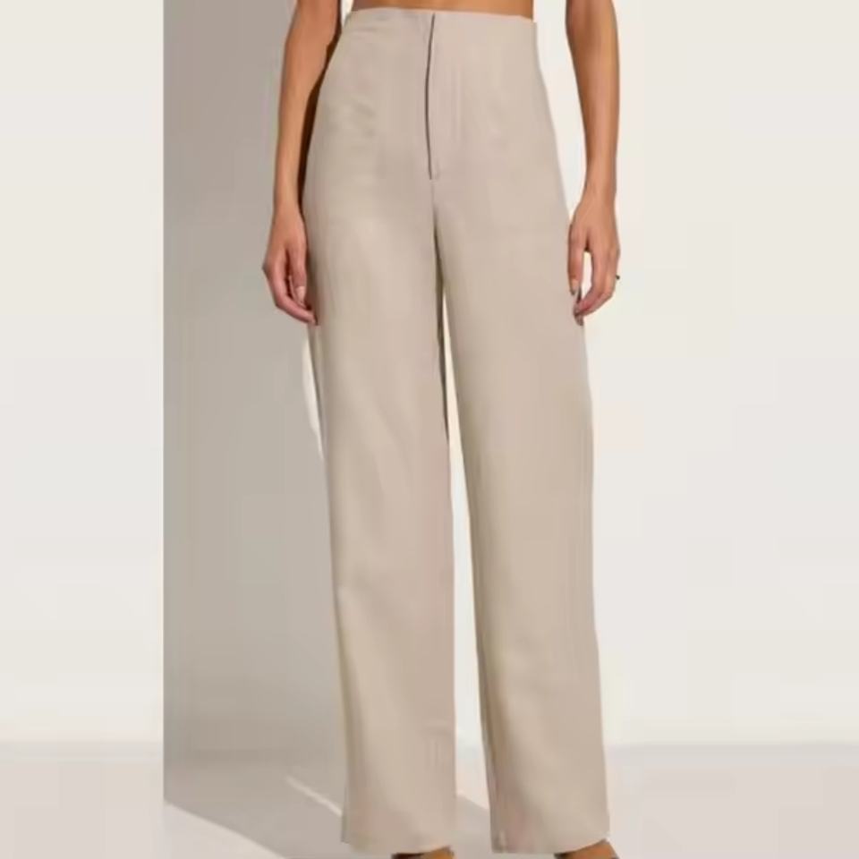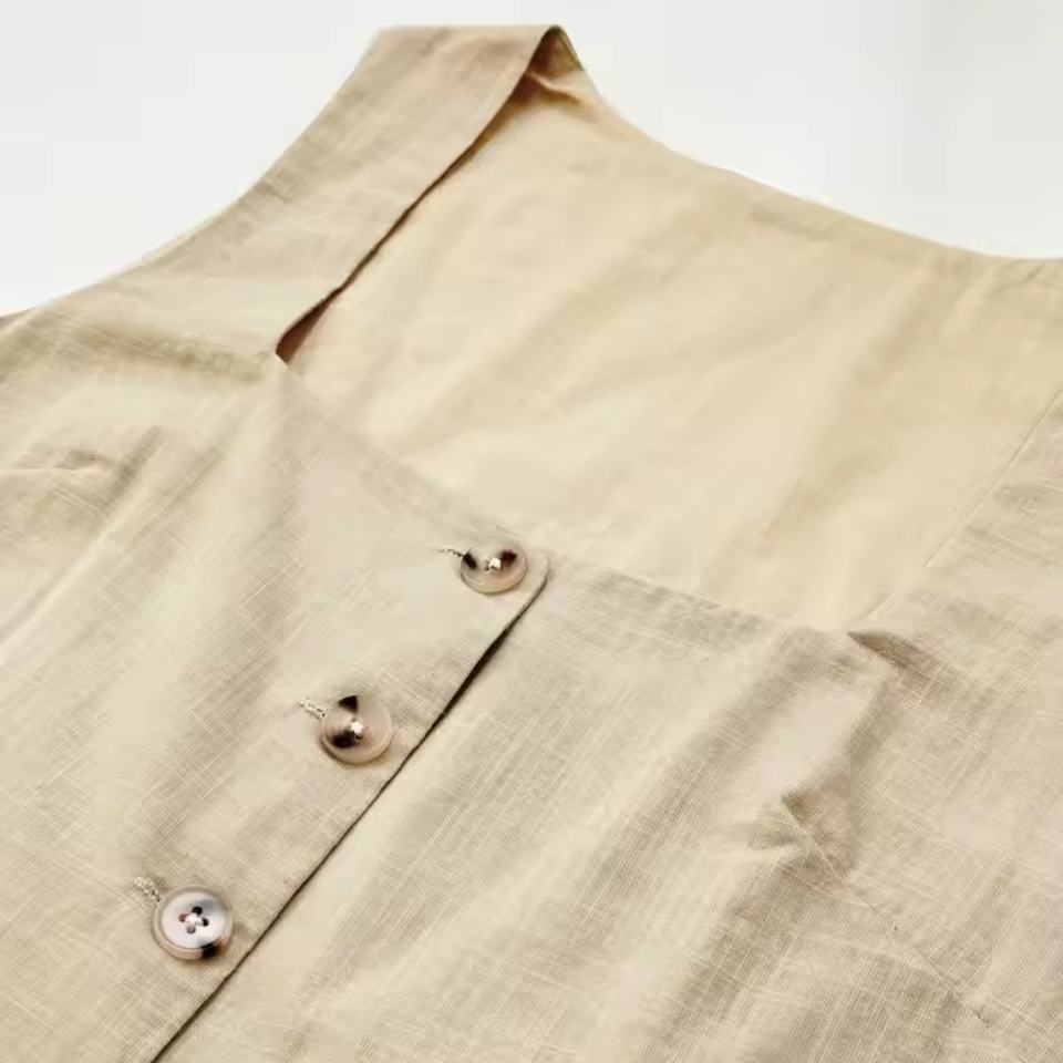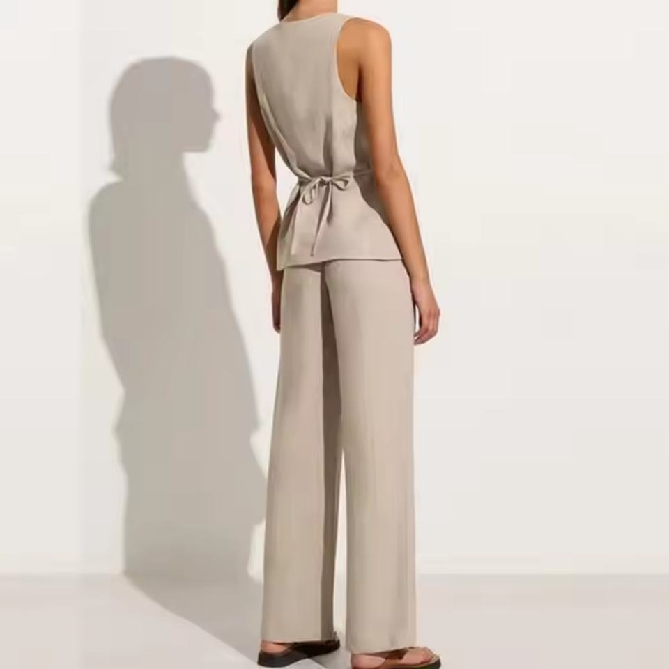 Ensemble deux pièces sur mesure en lin pour femme : pantalon droit et crop top sans manches à col carré