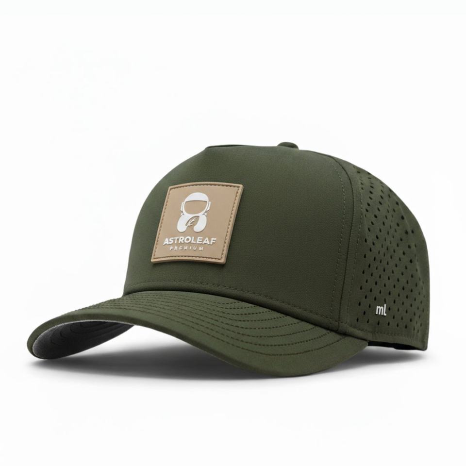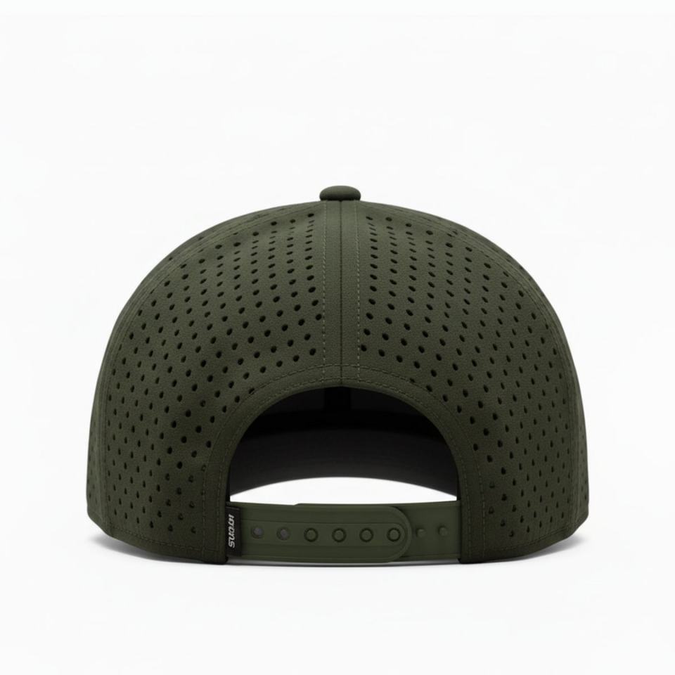 Casquette de baseball imperméable pour le sport de plein air, avec logo personnalisé OEM, 5 panneaux, patch en caoutchouc, découpe laser structurée, trous, fermeture à pression