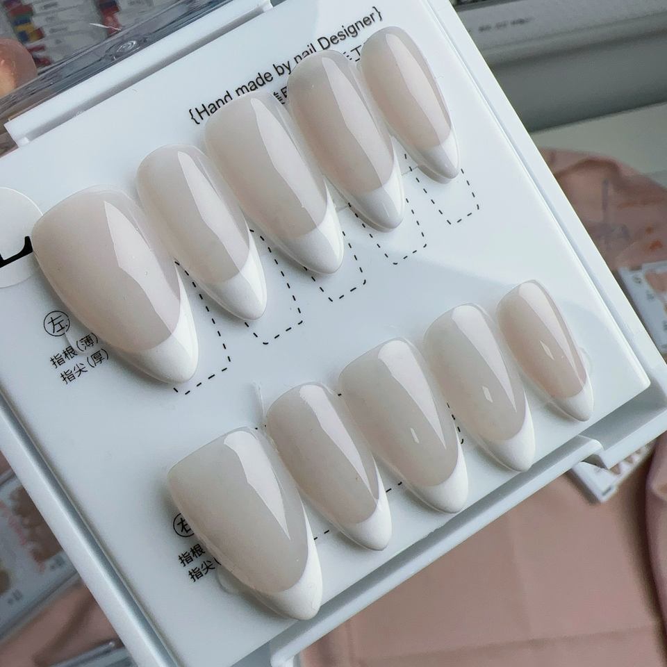 Ongles press-on faits main personnalisés avec logo OEM, courts, forme amande, double couche, en boîte, fourniture directe usine