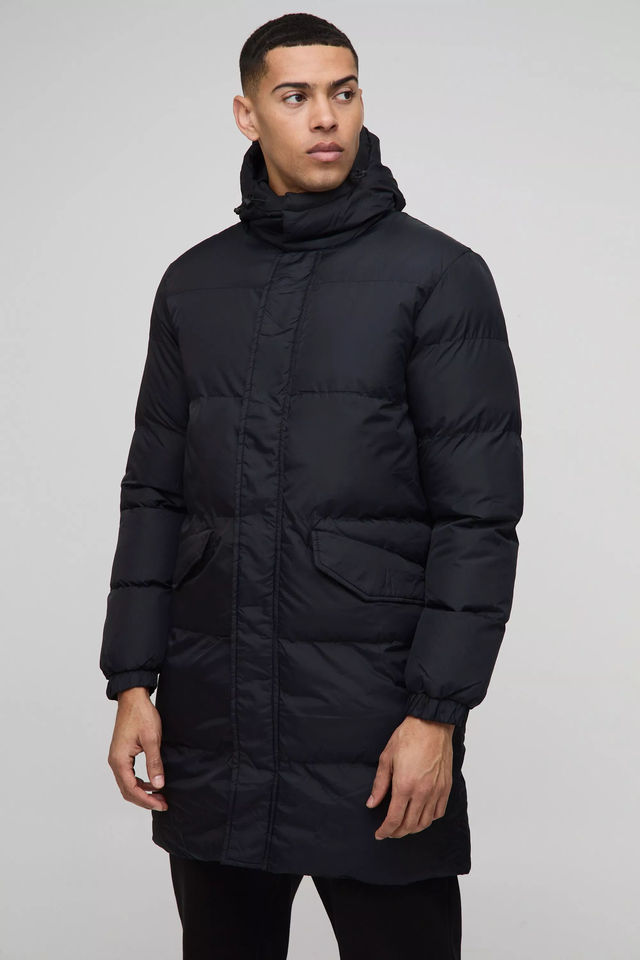Veste matelassée à capuche mi-longue pour homme avec logo personnalisé OEM, en noir, coupe-vent et chaude, en duvet matelassé de haute qualité, vestes pour homme