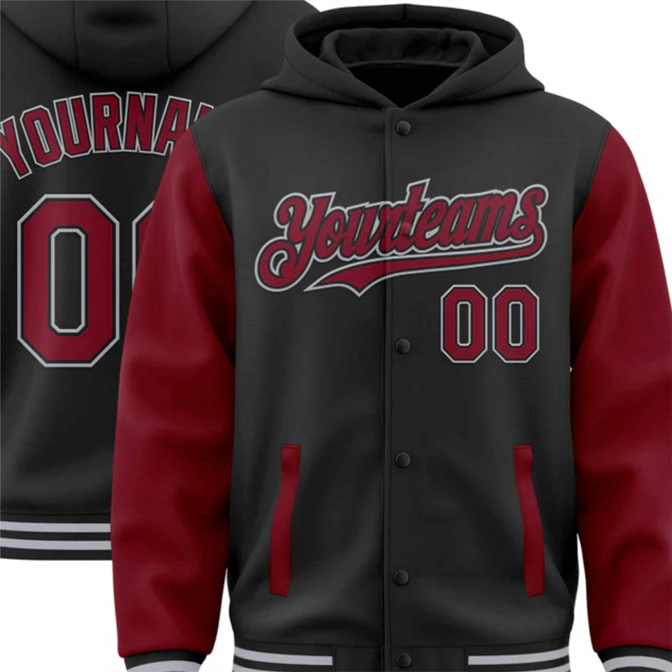 Veste à capuche bicolore fabriquée sur mesure par OEM Bomber noir cramoisi-gris Varsity Letterman Full-Snap motif imprimé brodé