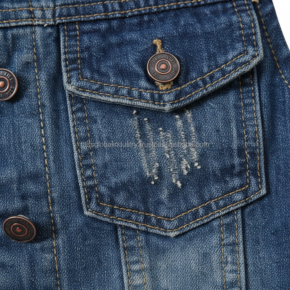 Gilet en jean délavé sur mesure pour homme, style rétro, bleu foncé, coupe ajustée, sans manches, avec détails brodés et doubles poches