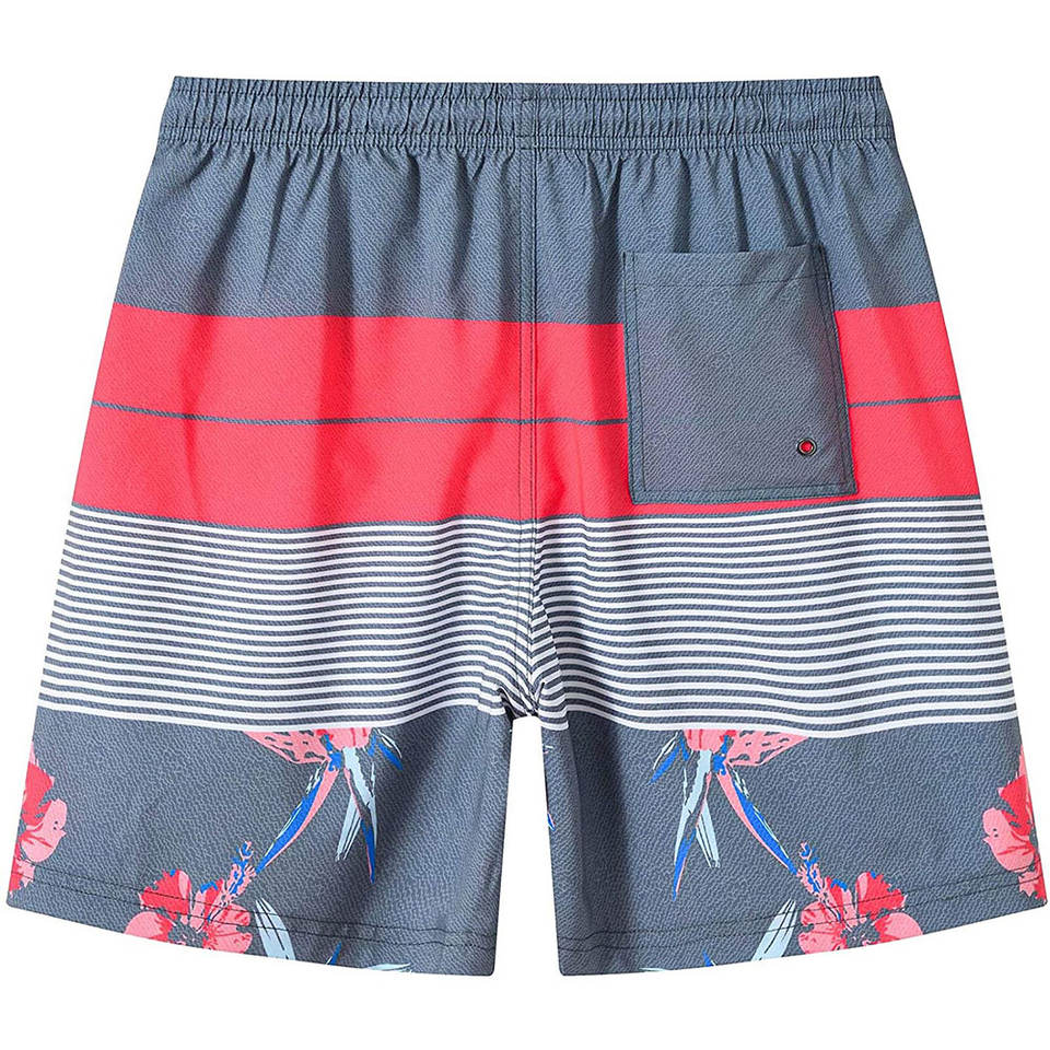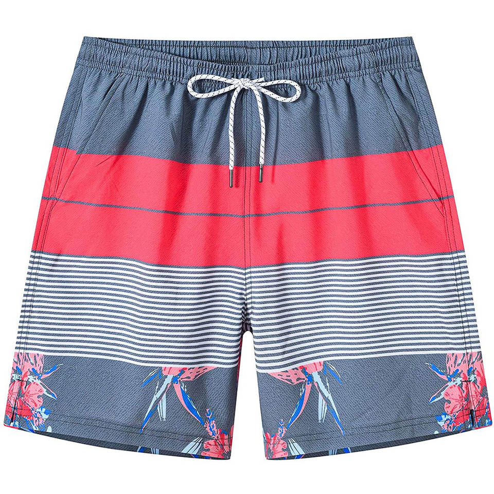 Shorts de bain pour hommes personnalisés OEM, couleur rouge et grise, vêtements de plage, séchage rapide, shorts de planche à voile, rayures florales, imperméable, coupe-vent, UV
