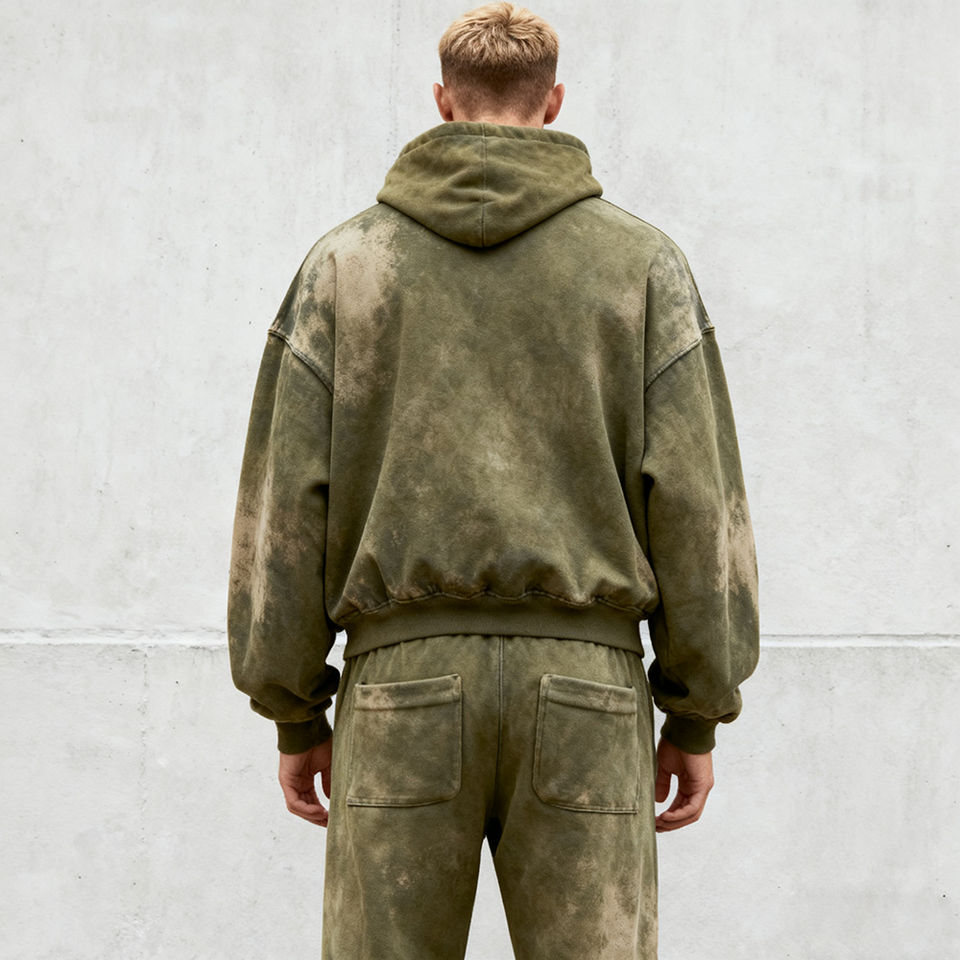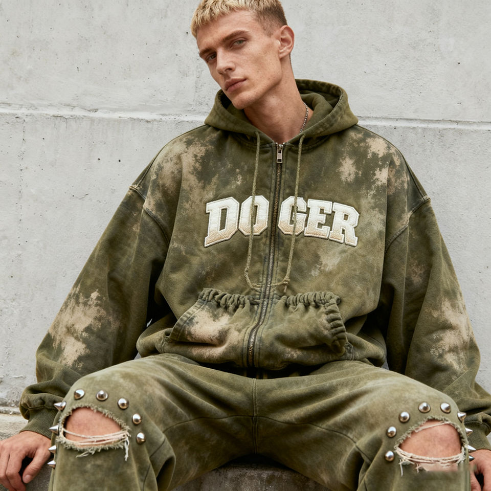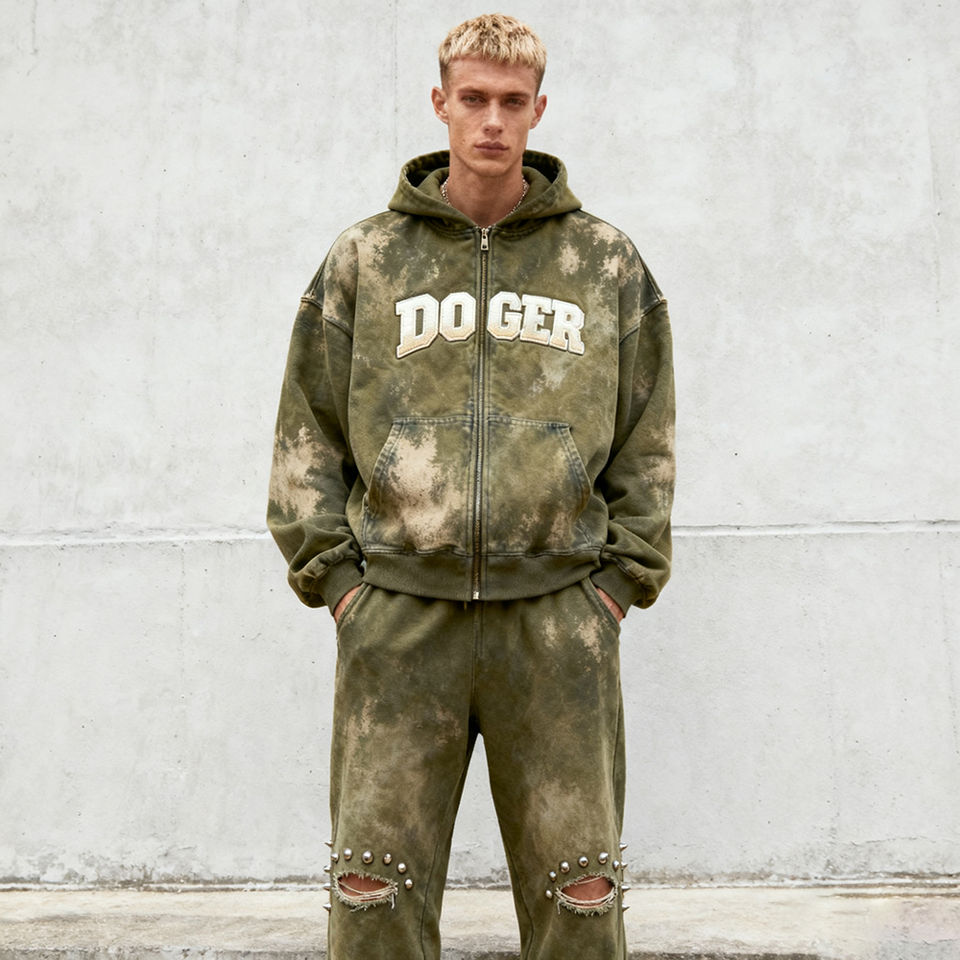 Sweat à capuche pour homme en molleton tricoté, style rétro, avec appliqué et effet délavé à l'acide, personnalisé OEM, et ensemble de jogging deux pièces gaufré, style streetwear