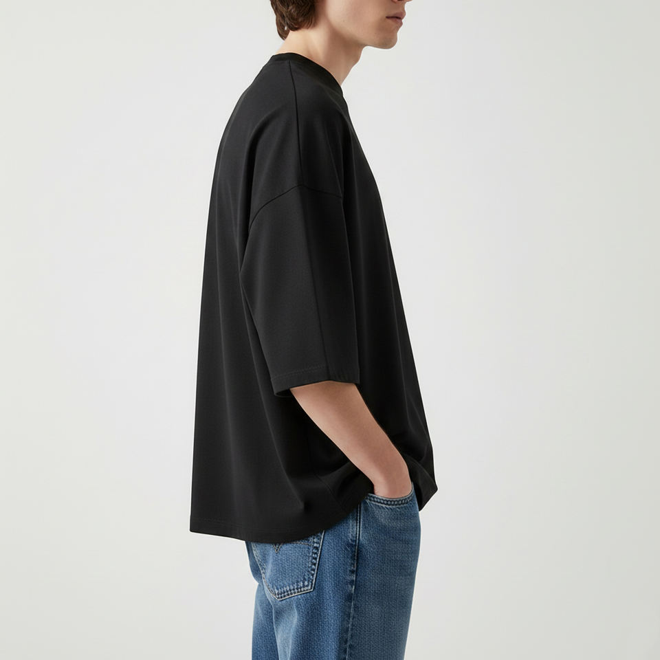 T-shirt homme en coton 100% lourd, couleur noire unie, coupe ample et oversize, logo imprimé sur mesure OEM, écologique.