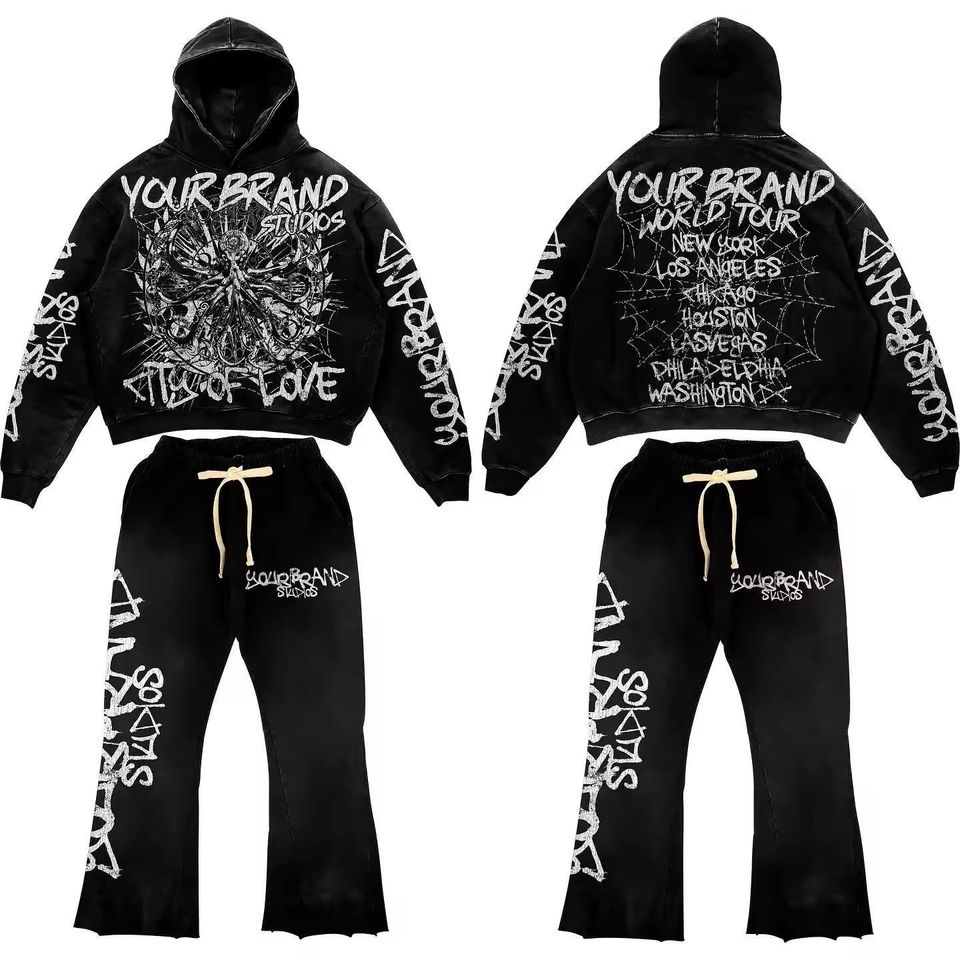 Ensemble sweat à capuche et pantalon évasé unisexe, personnalisé OEM, en molleton épais, style vintage, délavé à l'acide, imprimé sérigraphié, avec strass
