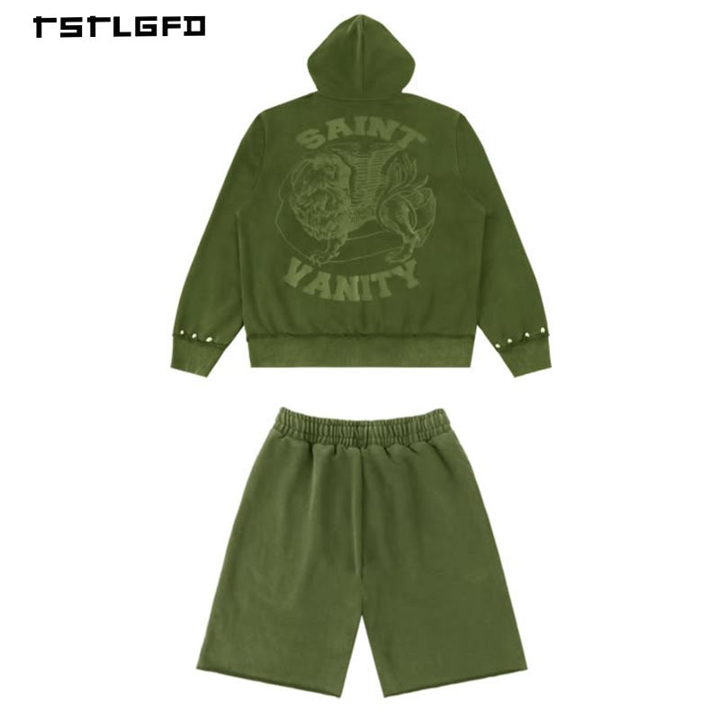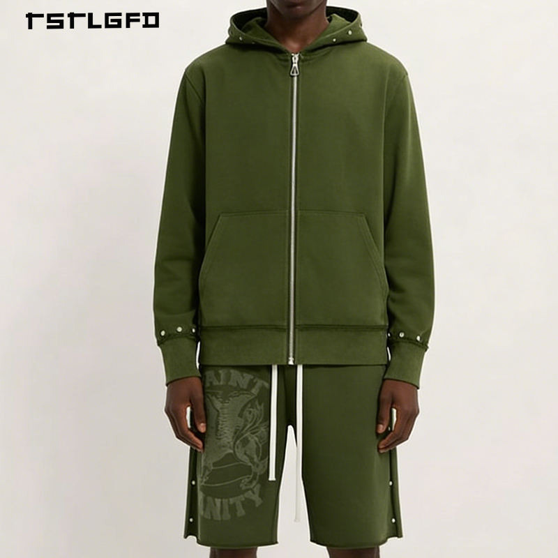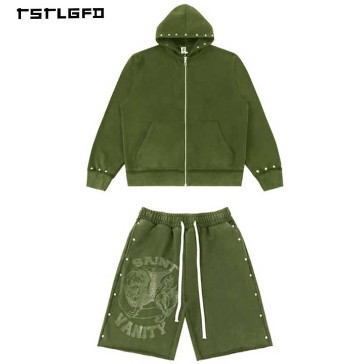 Ensemble de survêtement court deux pièces pour homme, personnalisé OEM, en coton délavé à l'acide vintage, avec sweat-shirt imprimé à fermeture éclair et clouté effet vieilli