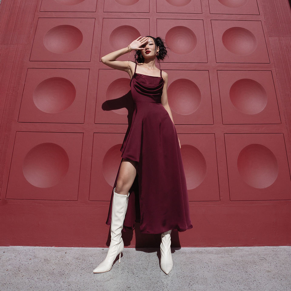 Soft draped neckline with flowy asymmetricFeature