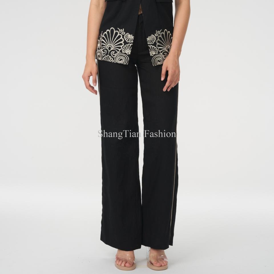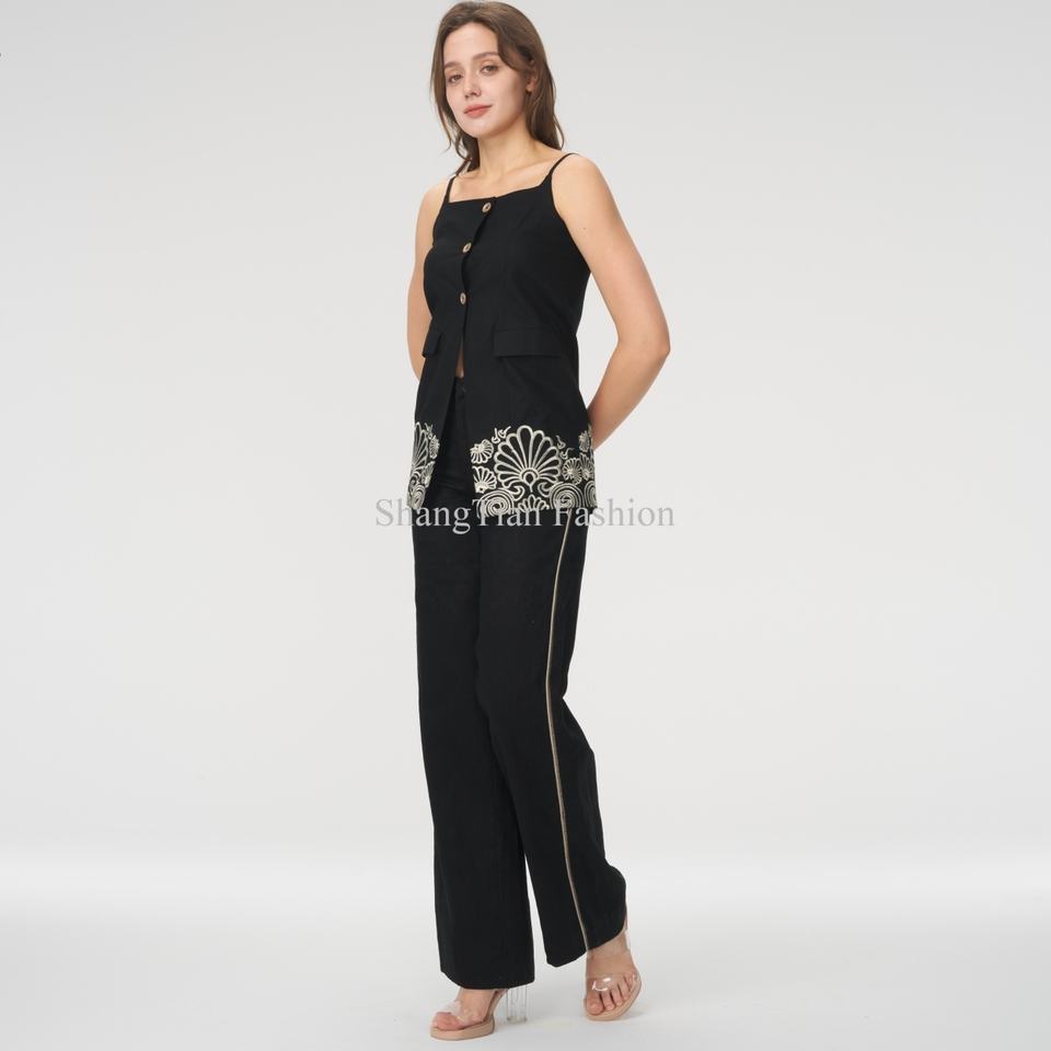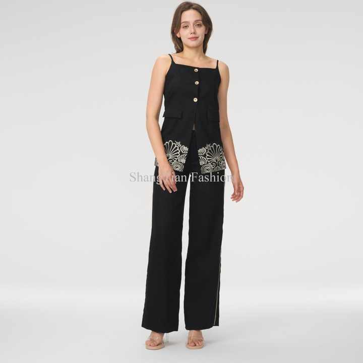 Ensemble en lin sur mesure pour femmes OEM, pantalon droit pour femmes d'affaires, haut court en lin sans manches à col carré, ensemble deux pièces