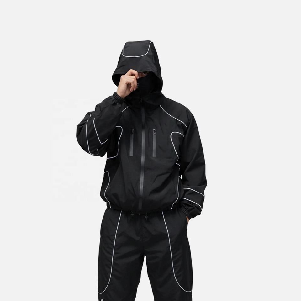 Ensemble survêtement homme coupe-vent imperméable réfléchissant en nylon et polyester avec fermeture éclair, personnalisable avec logo OEM (veste et pantalon)
