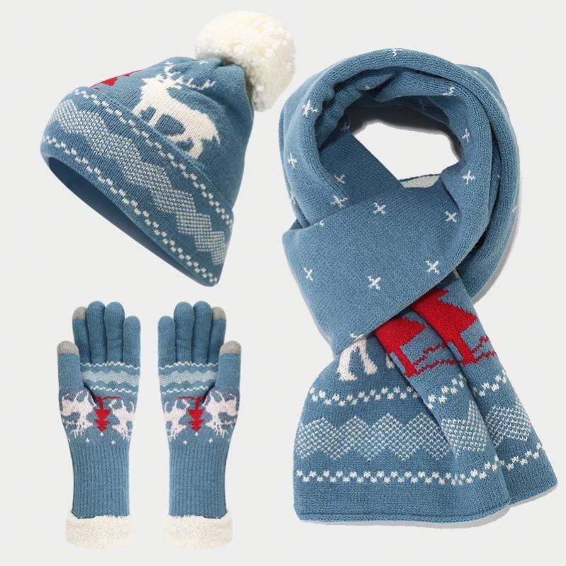 Ensemble tricoté personnalisable OEM renne de Noël : bonnet, écharpe, gants, bonnet à pompon doublé polaire, logo OEM, ensemble chaud d'hiver pour les fêtes, vente en gros