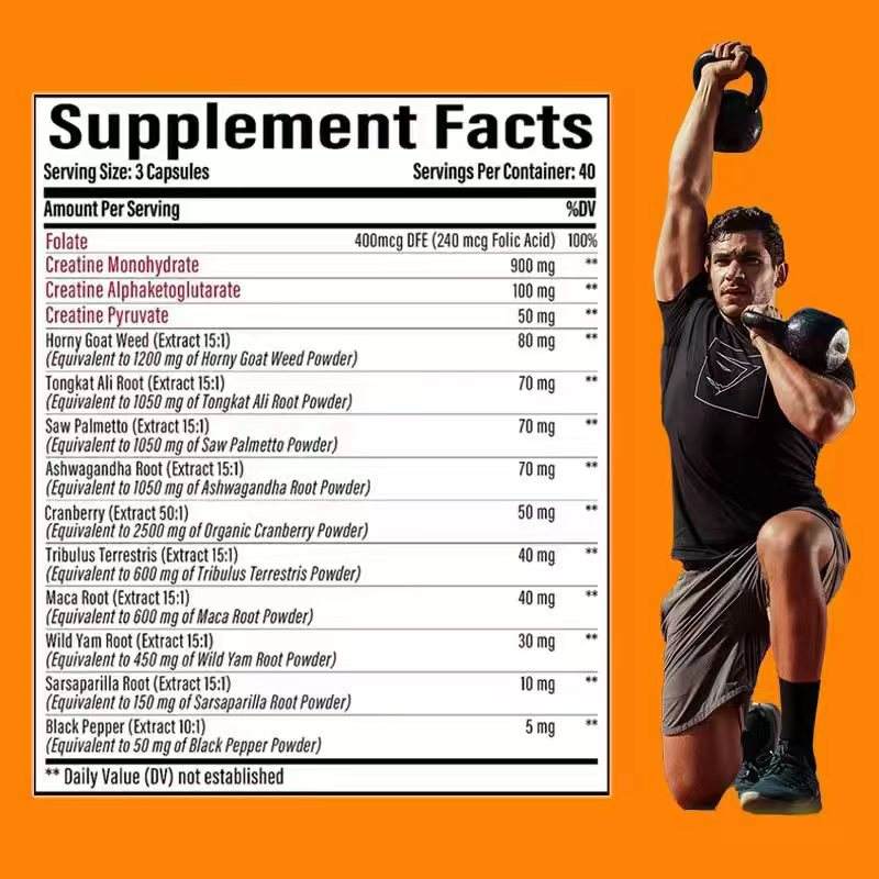 Ingrédient principal:Monohydrate de créatine, Alphaketoglutarate de créatine, Pyruvate de créatine, Extrait d'épimède, Extrait de palmier nain, Extrait de racine d'ashwagandha, Extrait de Tribulus Terrestris, Extrait de racine de maca, Extrait de racine d'igname sauvage, Extrait de racine de séné, Extrait de poivre noir