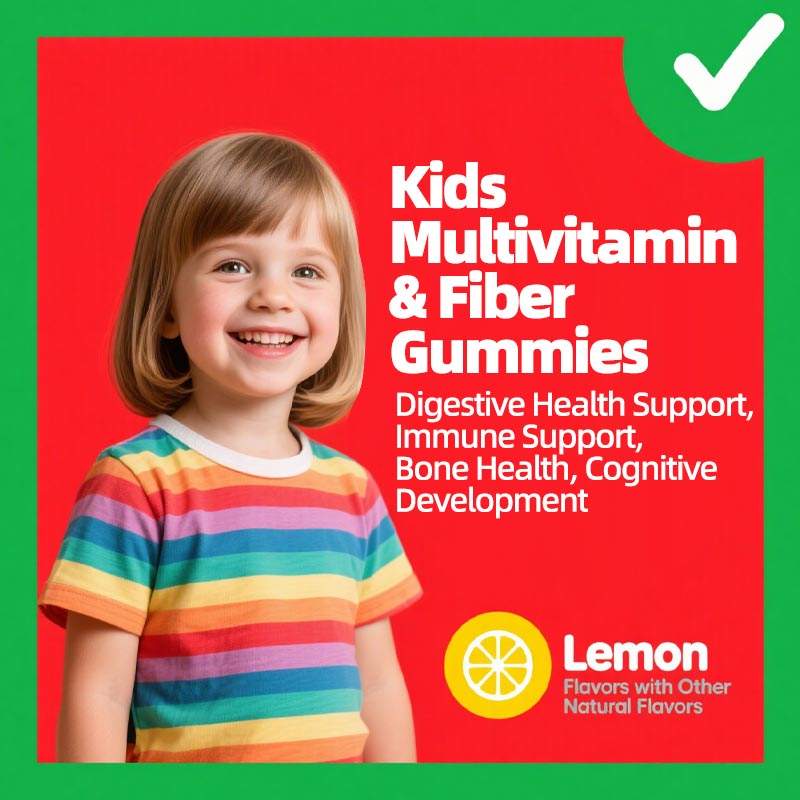 Gummies multivitaminées personnalisées OEM pour enfants et adolescents, enrichies en vitamines D3, B12, B6, zinc, biotine, folate et prébiotiques pour favoriser la digestion