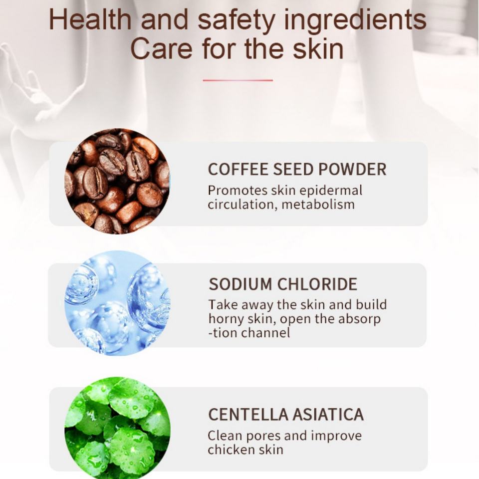 Poudre de graines de café, Chlorure de sodium, Centella Asiatica