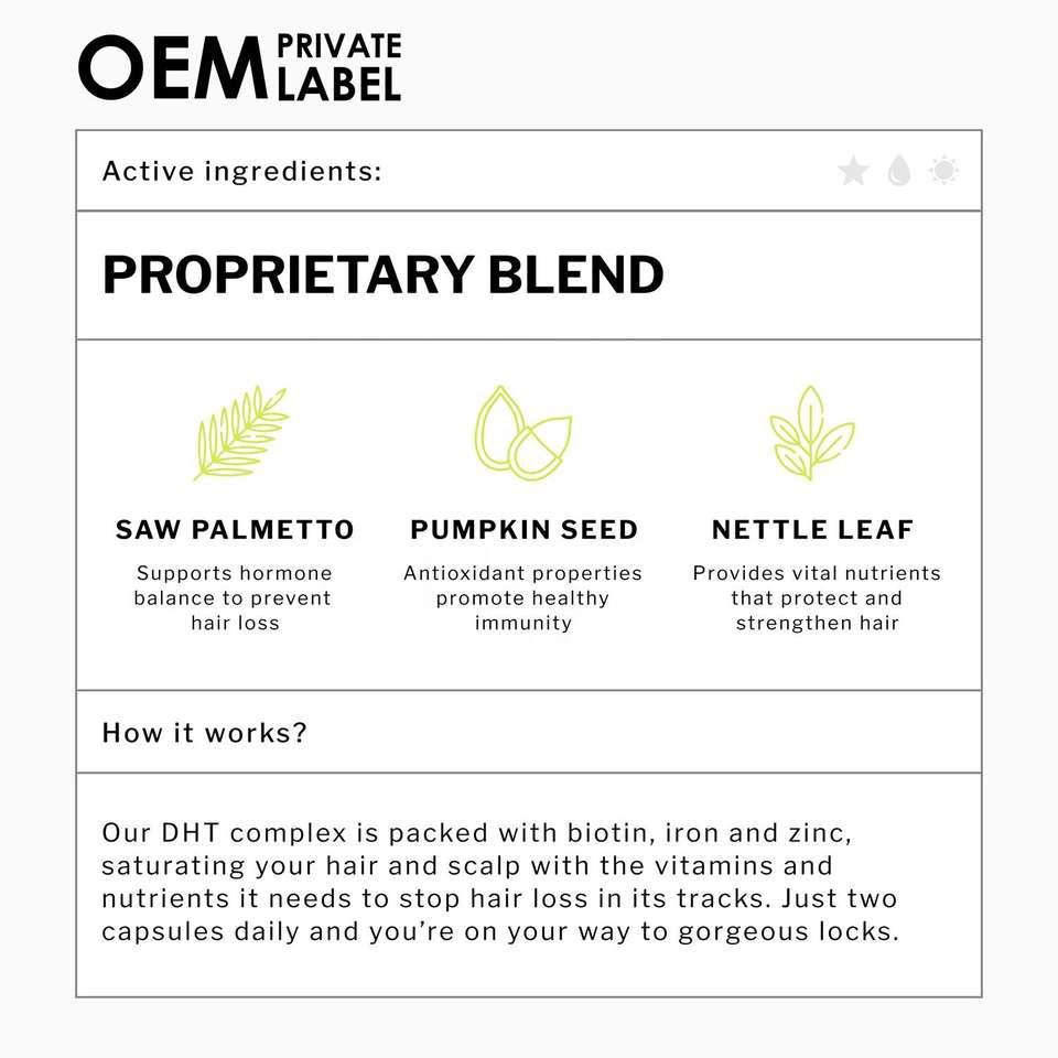 Capsules Bloqueurs DHT OEM, Supplément Végétalien Biotine et Palmier Nain, Vitamines pour Cheveux Sains et Forts, Capsules de Croissance, Supplément Anti-Chute de Cheveux