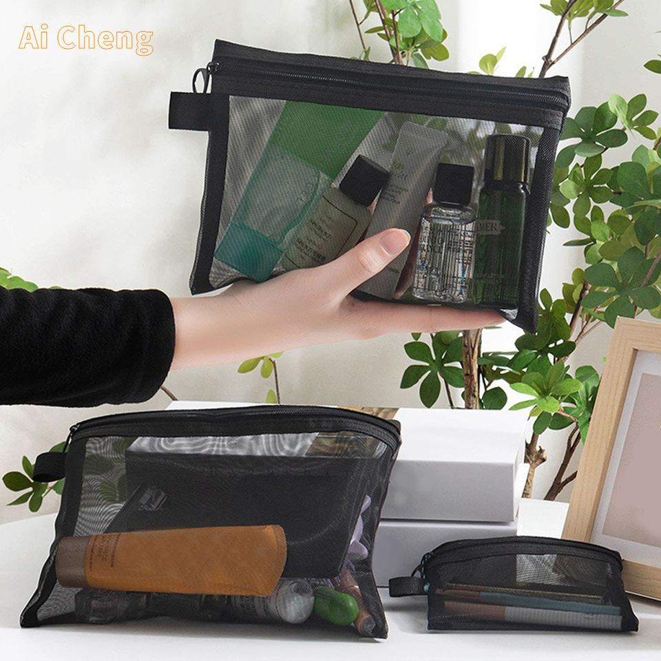 Sac à fermeture éclair en maille de nylon écologique OEM, portable et durable, sac de rangement pour maquillage de voyage, rangement pour lavabo à grille