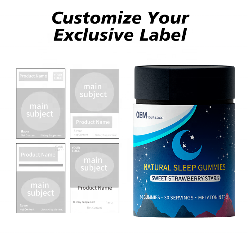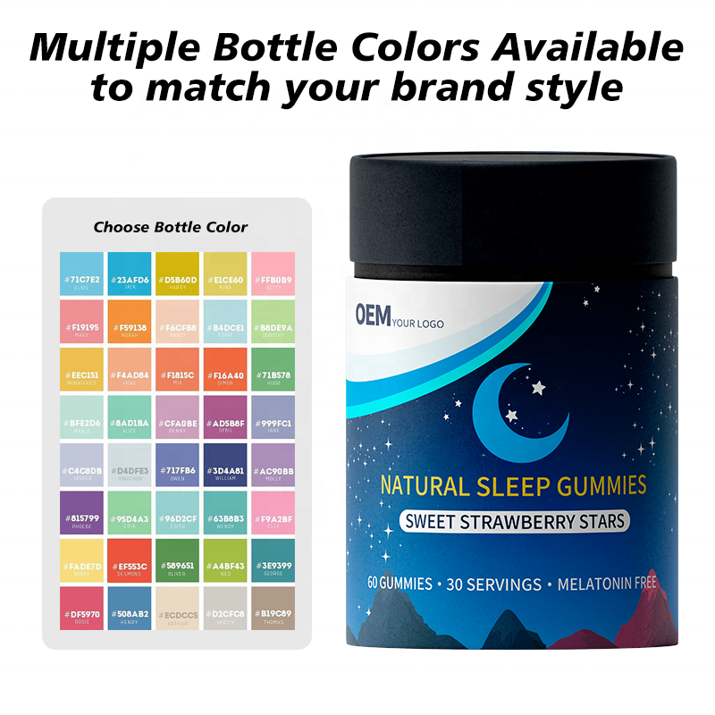 Emballage personnalisé de gommes naturelles pour le sommeil, fabrication OEM, plusieurs designs d'étiquettes, options bouteille + boîte et MOQ flexible pour les clients de marque