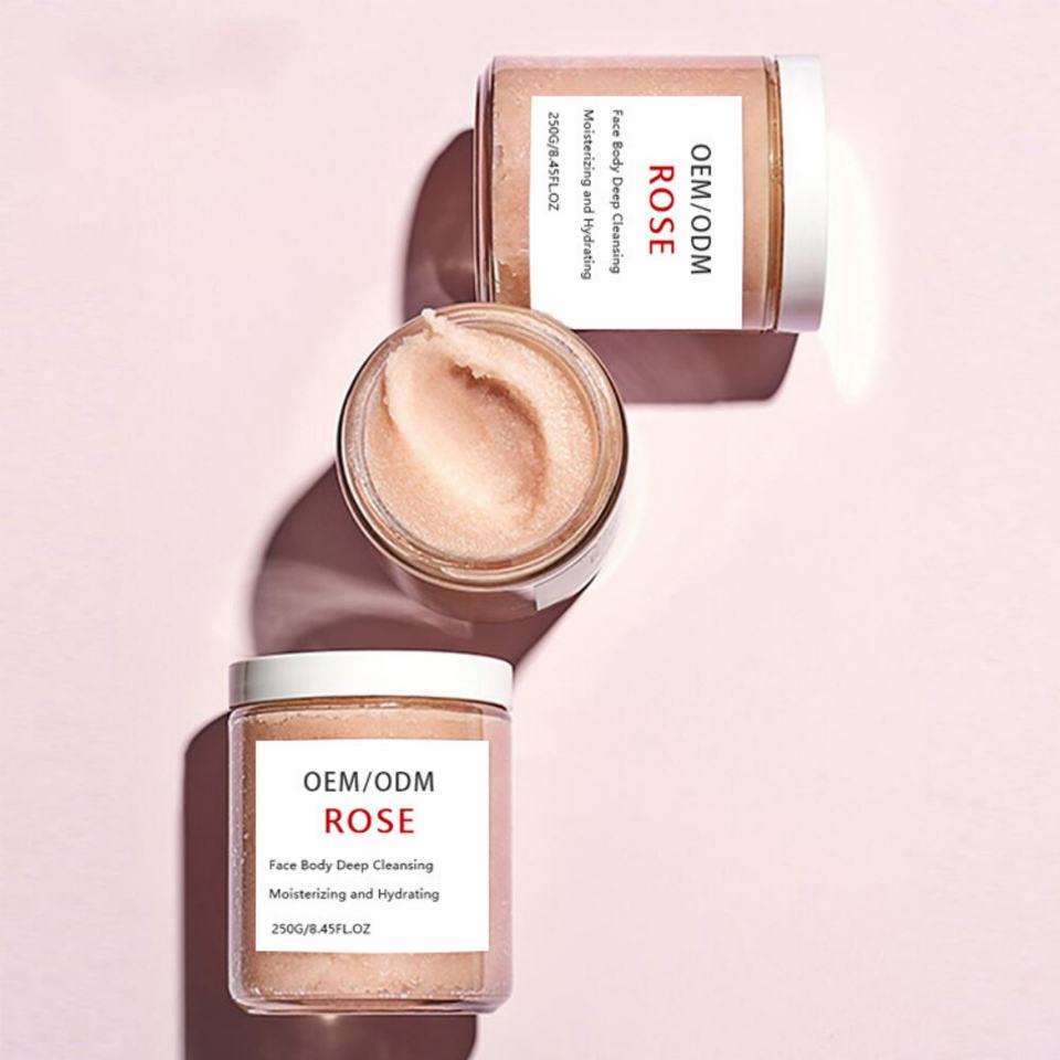 Crème exfoliante hydratante pour le corps à la rose, personnalisable avec logo d'usine OEM, à base d'huile d'amande douce, pour le soin de la peau du visage et du corps