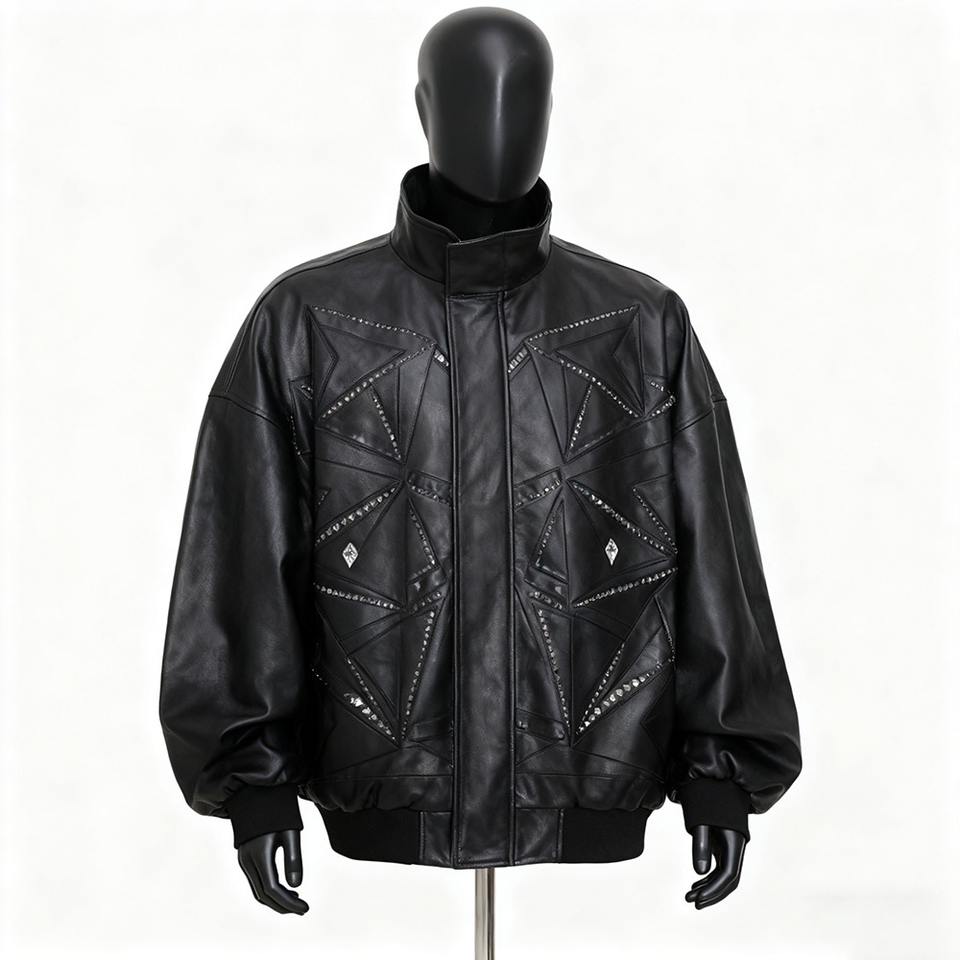 Blouson Bomber Homme en Cuir PU, Nouvelle Collection Hiver, Design Tendance OEM, Broderie Lourde, Strass, Col Montant, Fermeture Avant