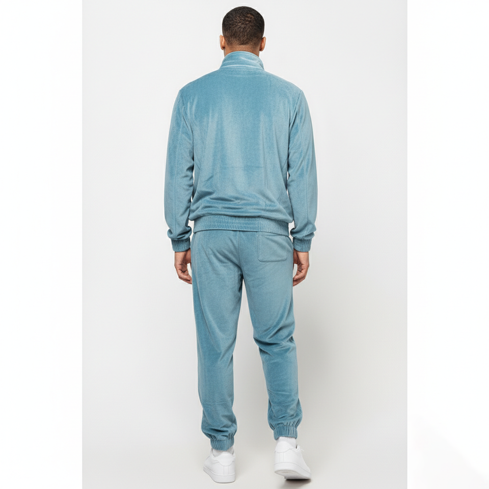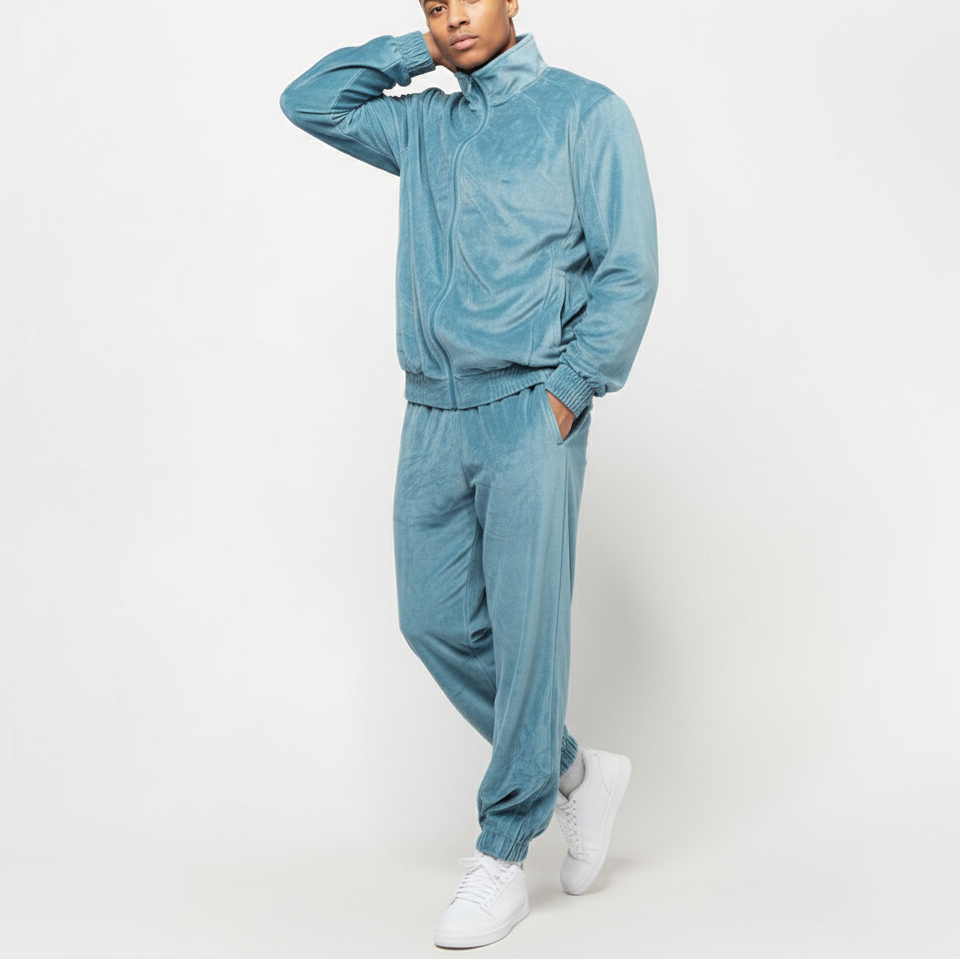 Survêtement Homme en Velours Imprimé Personnalisé avec Logo, Marque Privée, Bleu, Sportswear Tendance, Cordon de Serrage, 100% Velours