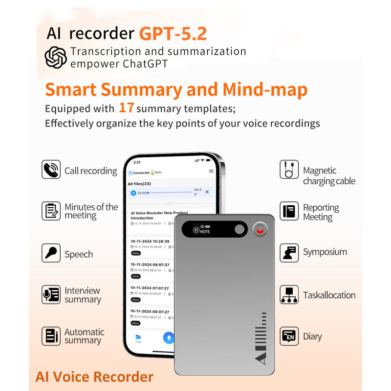 Enregistreur vocal IA OEM avec abonnement gratuit, prise de notes ChatGPT pour réunions, transcription, résumé, mind map, 64 Go, 36h d'enregistrement