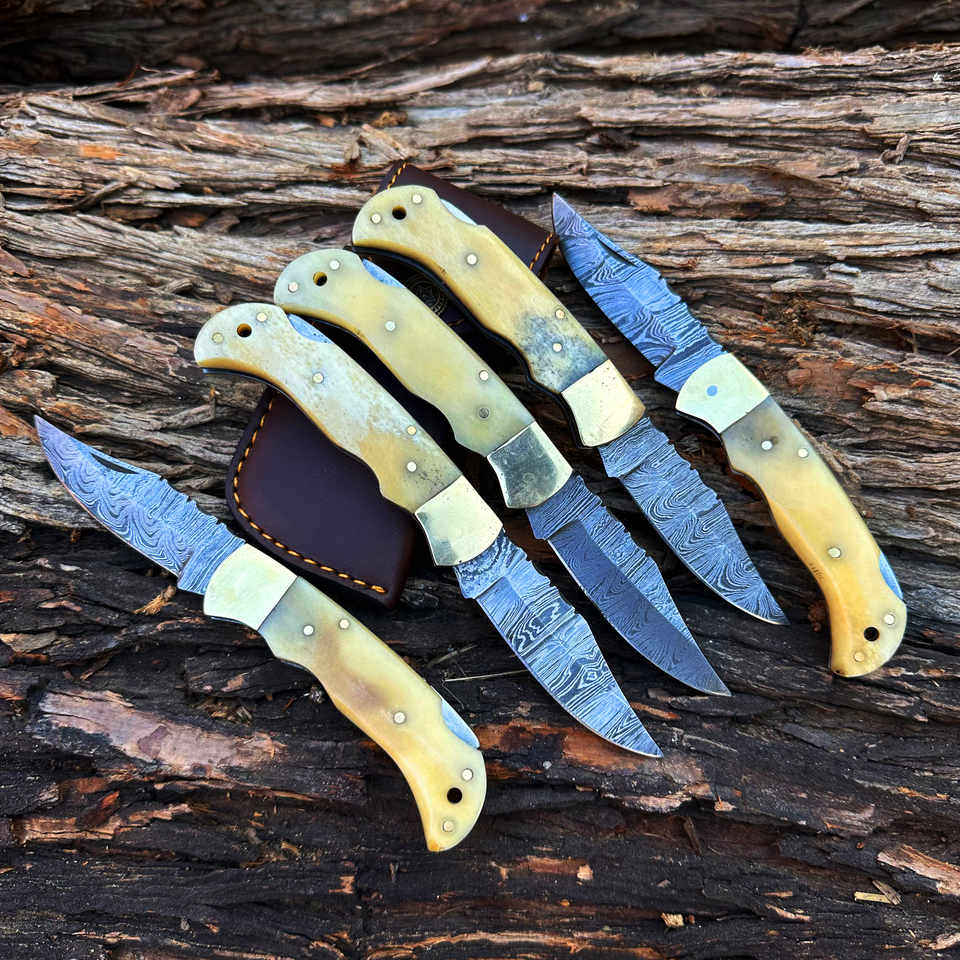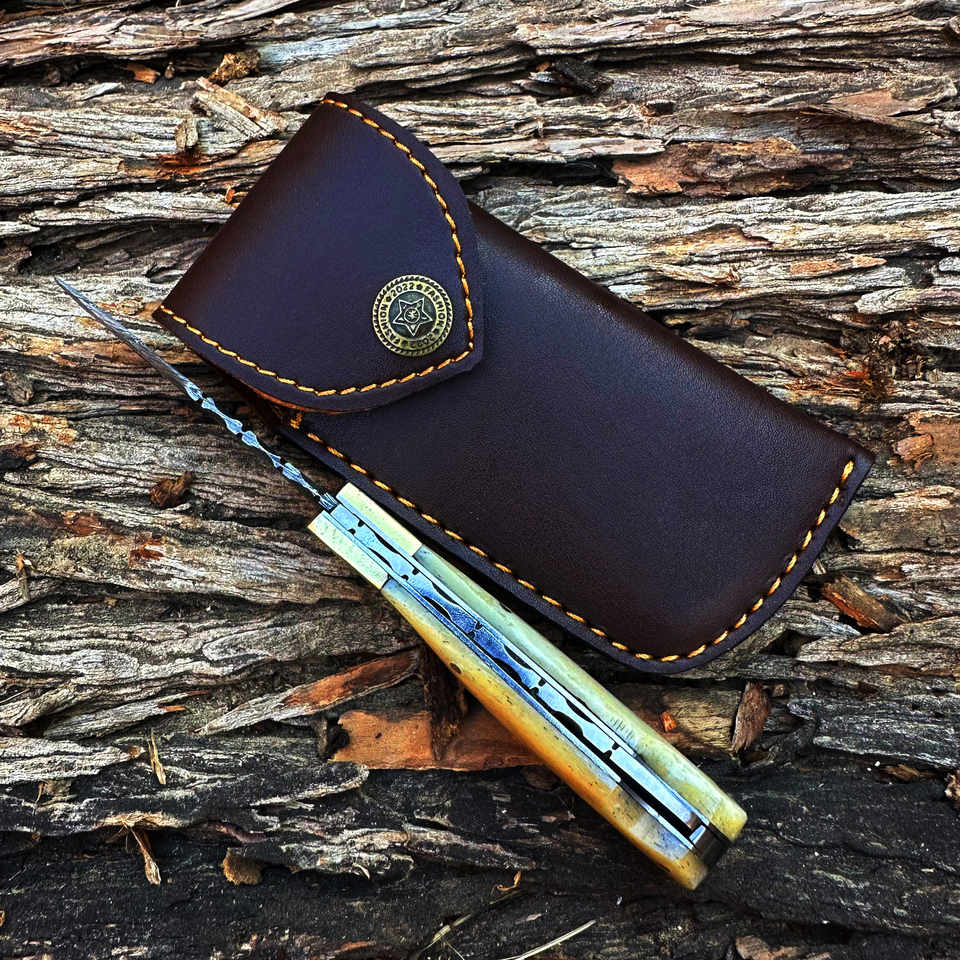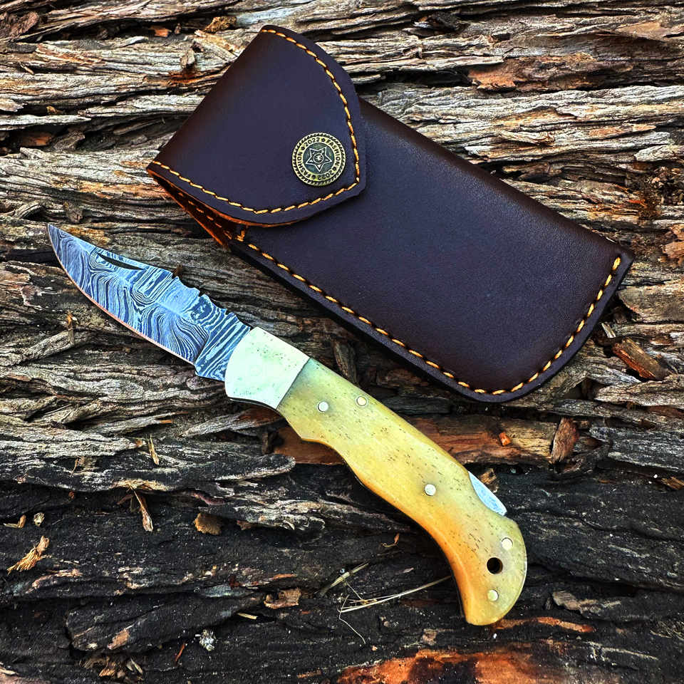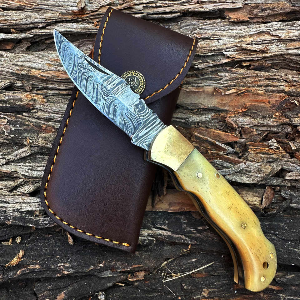 Couteau pliant OEM forgé à la main en acier Damas de 6,5 pouces, pointe droite, manche en os naturel, étui en cuir, qualité industrielle