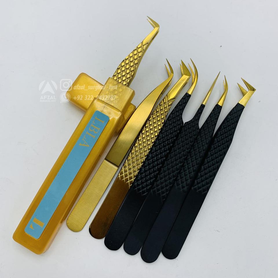 Pince à épiler OEM de haute qualité, durable et de précision, en acier inoxydable, pour extensions de cils, avec poignée personnalisée en fibre noire et or diamantée