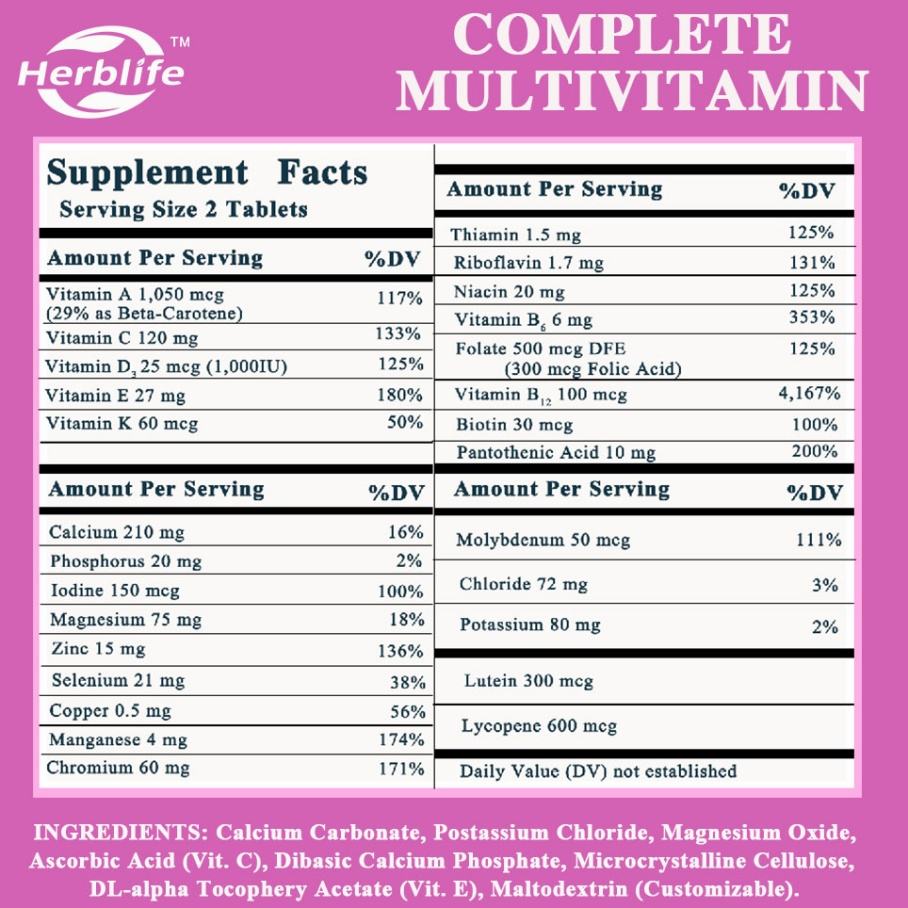 Carbonate de calcium, Chlorure de potassium, Oxyde de magnésium, Acide ascorbique (Vit.c), Phosphate de calcium dibasique, Cellulose microcristalline, Acétate de DL-alpha tocophéryl (Vit.É), MaltodextrineIngrédient principal