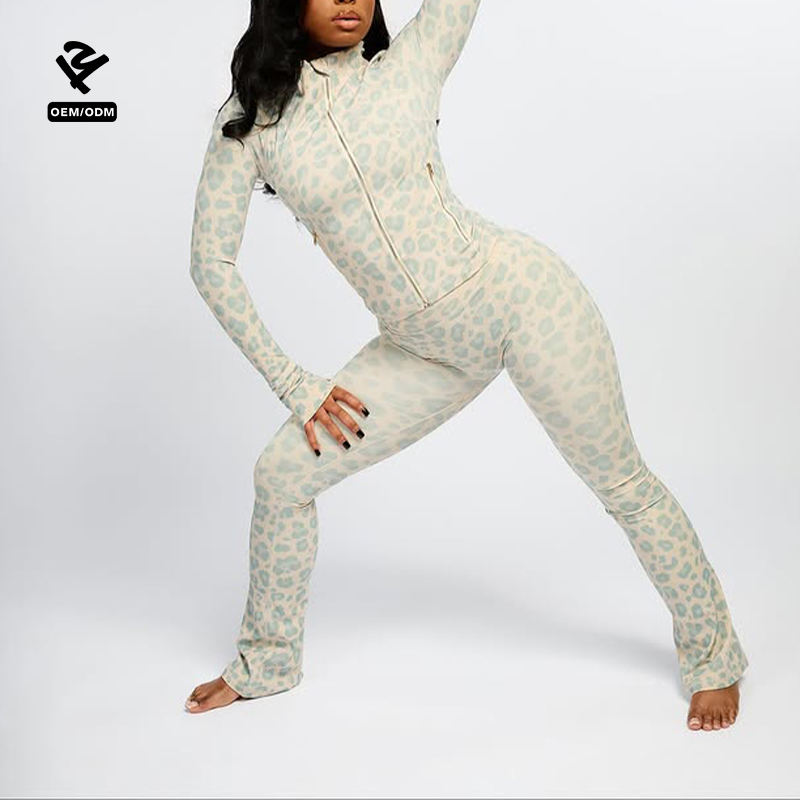 Ensemble de survêtement OEM imprimé léopard à fermeture éclair, deux pièces, haut moulant à trous pour les pouces, pantalon évasé taille haute, pour le fitness, la gym et le jogging