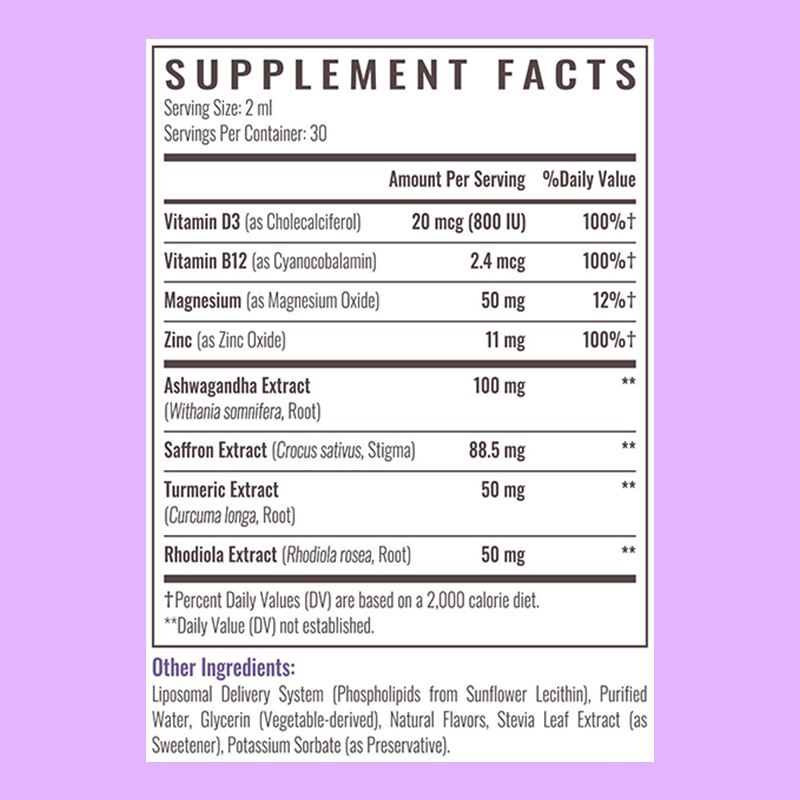 Magnesium, Saffron Extract, Turmeric Extract, Rhodiola Extract, Zinc, Vitamin B12