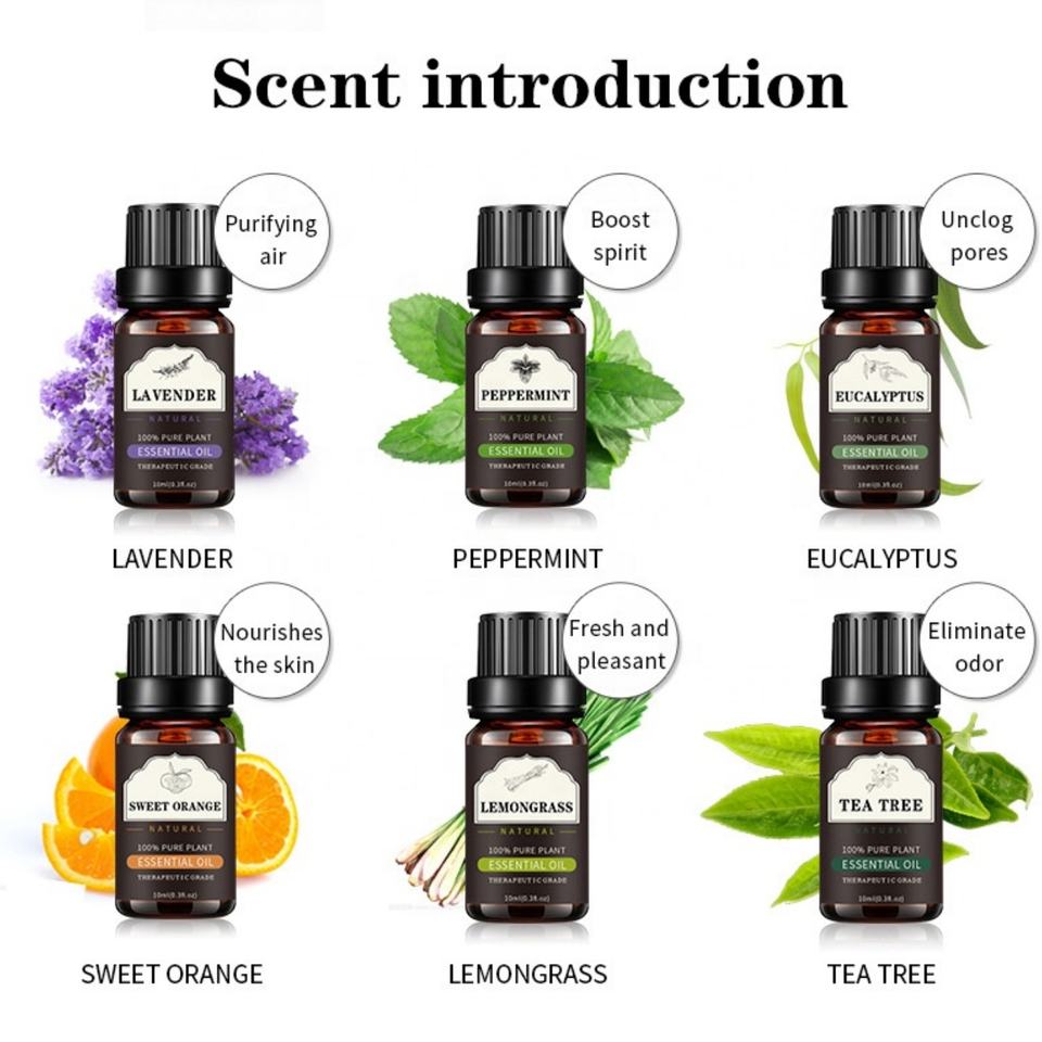 Rose, Arbre de thé, Eucalyptus, Lavande, Pamplemousse, Bergamote , Santal, Menthe poivrée, Ylang-ylang