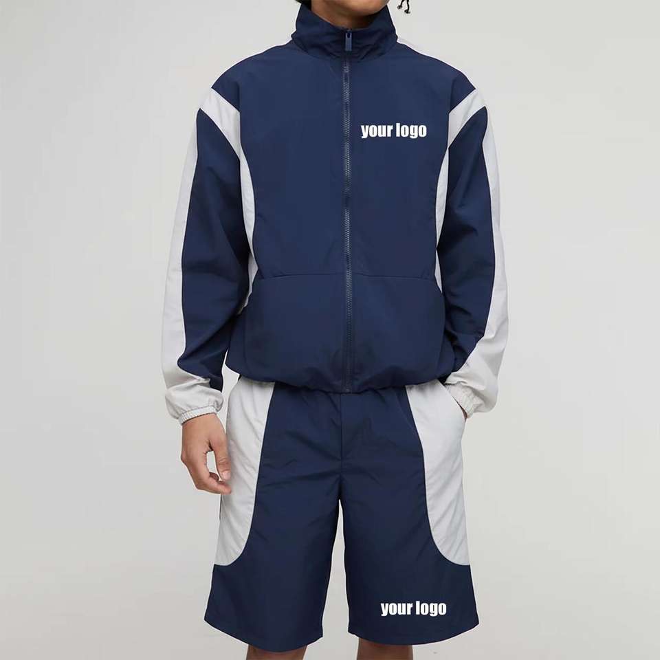 Ensemble de survêtement réfléchissant en nylon respirant pour homme, coupe-vent 2 pièces personnalisé avec short et veste zippée, style streetwear OEM