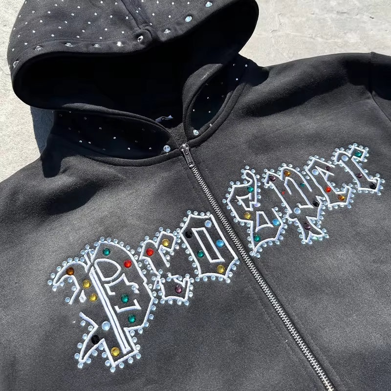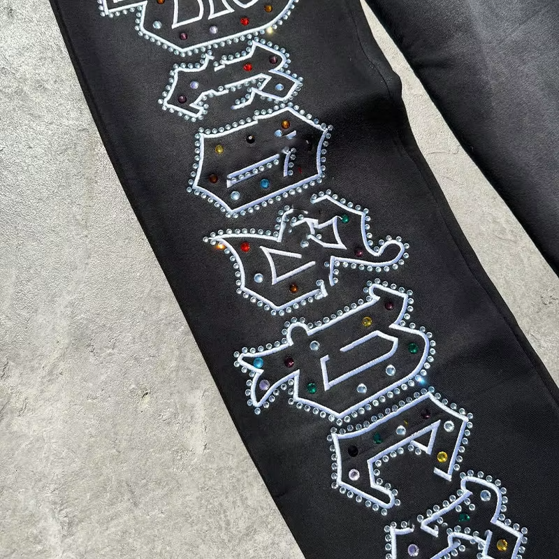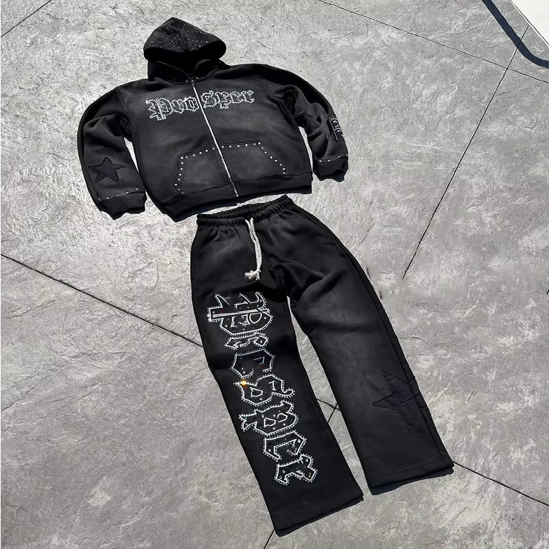 Ensemble de survêtement pour homme OEM, personnalisé, imprimé à l'écran, avec strass, sweat-shirt à capuche et pantalon de survêtement évasé et superposé, pour l'hiver