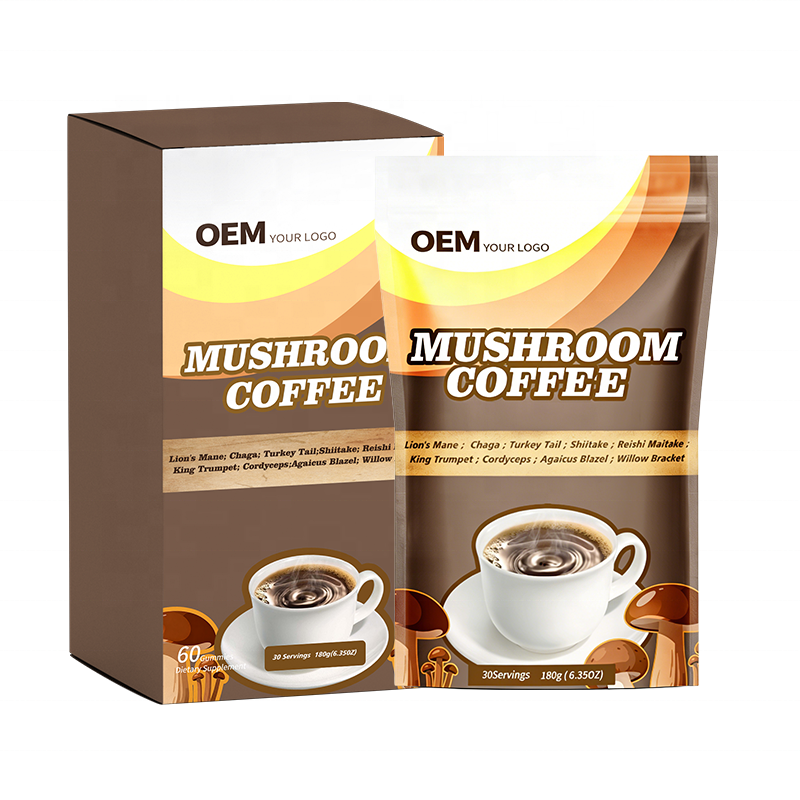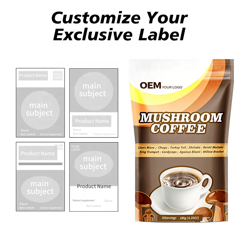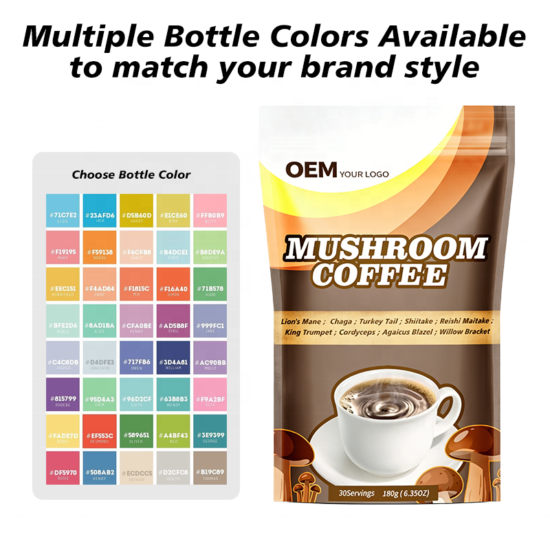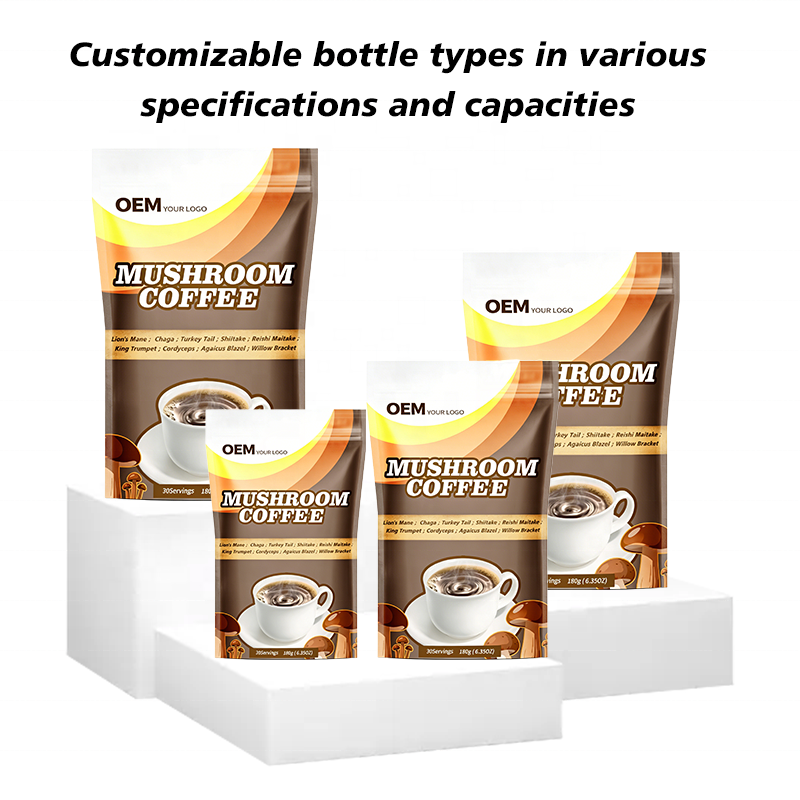 Usine OEM de café aux champignons : Emballage personnalisé, plusieurs designs d'étiquettes, options bouteille + boîte et MOQ flexible pour les clients de marque