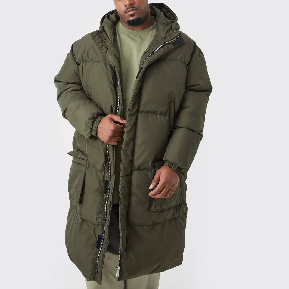 Doudoune longue en polyester OEM/ODM 100% pour hommes, veste d'hiver à capuche rembourrée et à fermeture éclair complète avec logo brodé personnalisé pour hommes