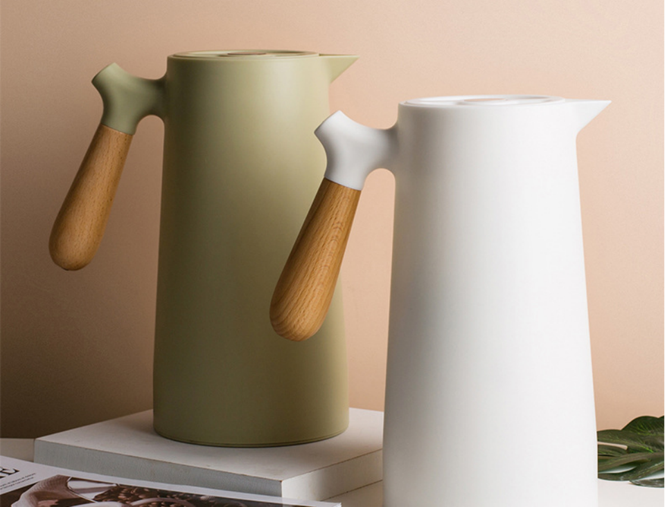 OEM / ODM Bouilloire isotherme à double paroi en verre de grande capacité 1000 ml avec coque intérieure en PP et poignée en bois