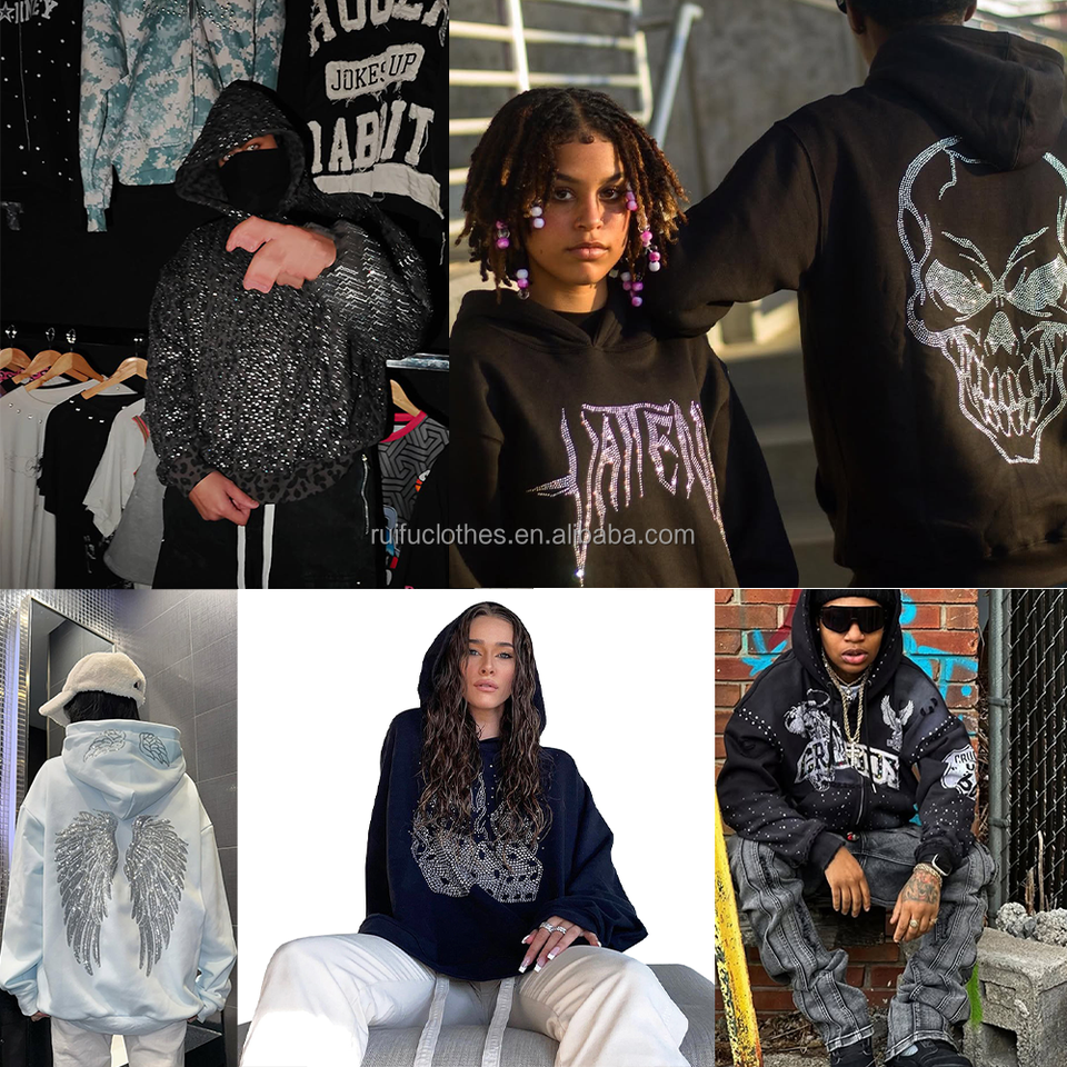 Sweat-shirts personnalisés OEM ODM de luxe avec broderie 3D en strass, impression DTG, streetwear, coton, coupe ample, pour hommes