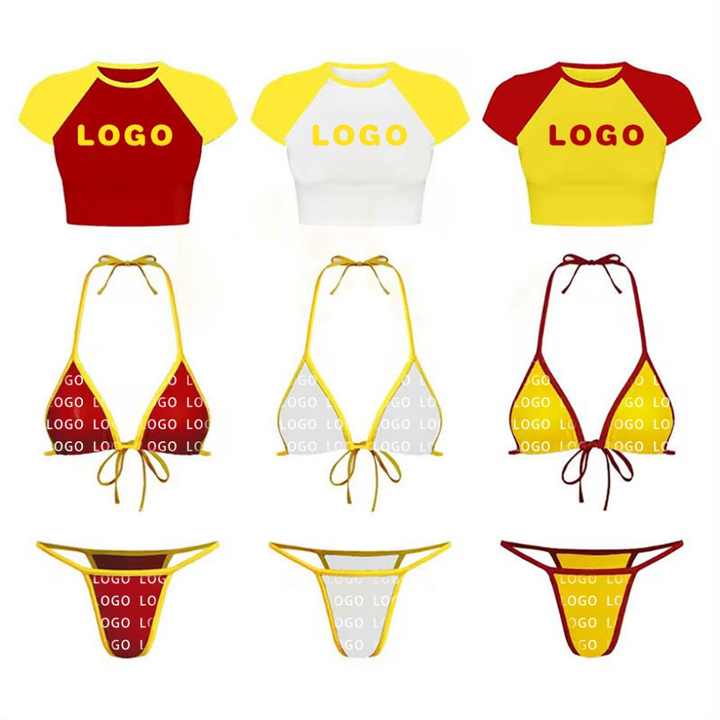 OEM/ODM Personnalisé MOQ 50 Pièces Grande Taille Maillot de Bain Color Block pour Femme, Ensemble T-shirt et Bikini Imprimé Carreaux