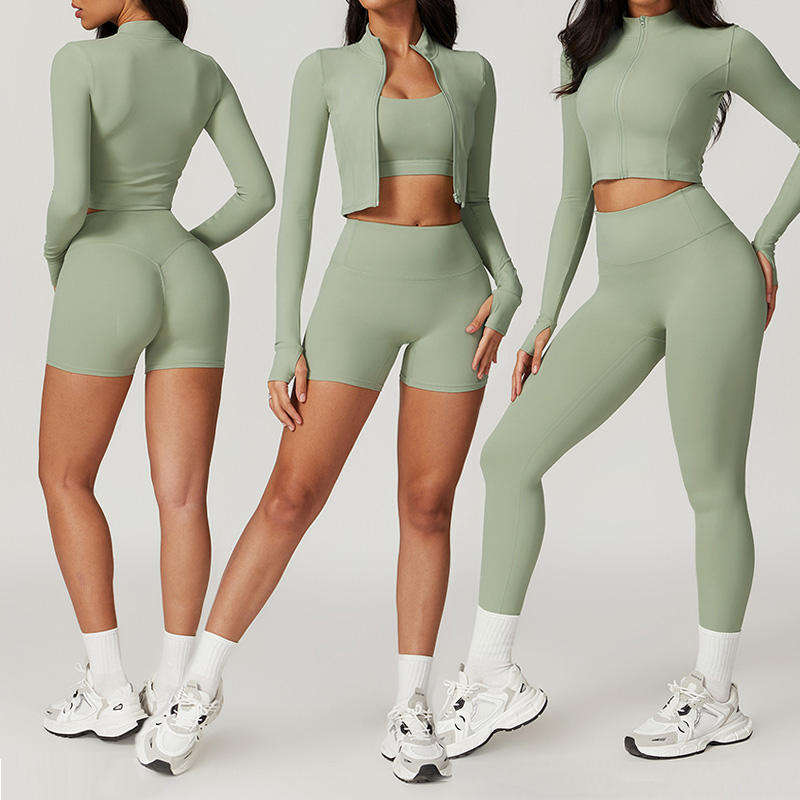 Ensemble de yoga pour femmes personnalisé OEM & ODM 2024, 4 pièces, vêtements de sport respirants, leggings de sport avec manches longues, vêtements d'entraînement sans couture