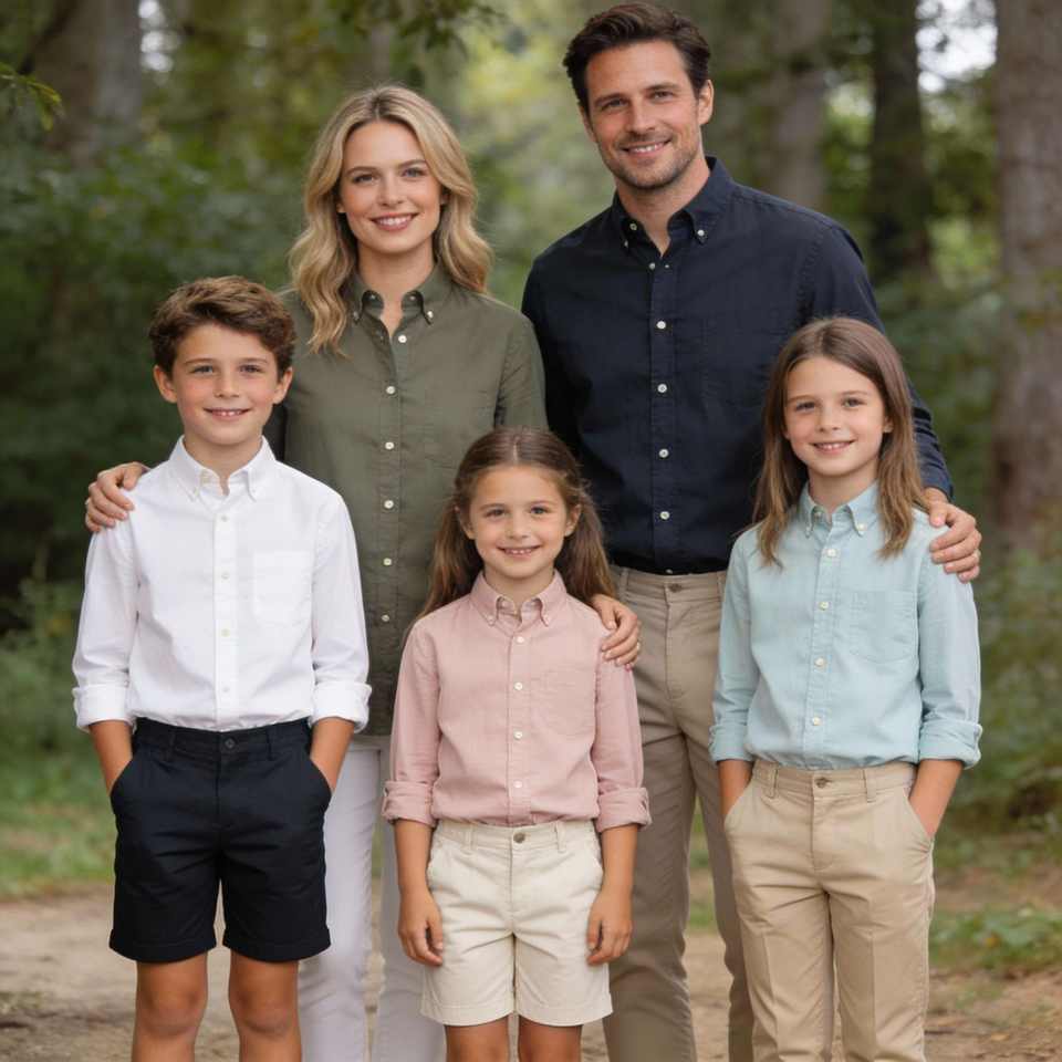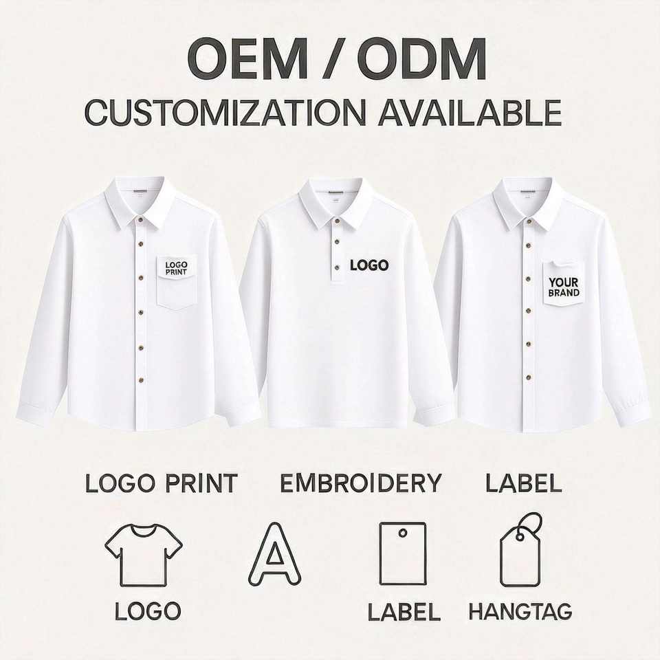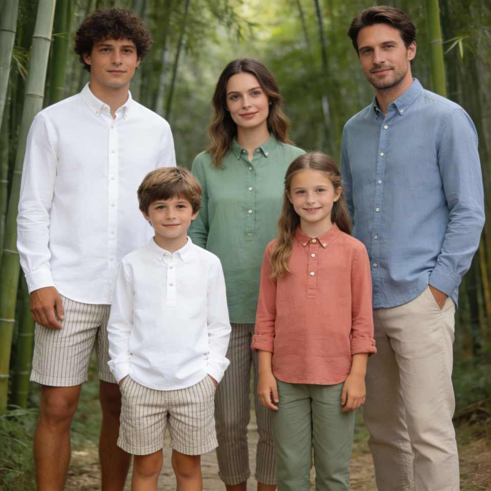 Chemise à manches longues boutonnée pour homme, garçon et fille, design OEM ODM, en coton de bambou assorti, chemises boutonnées avec pantalon en sergé, shorts