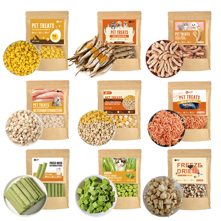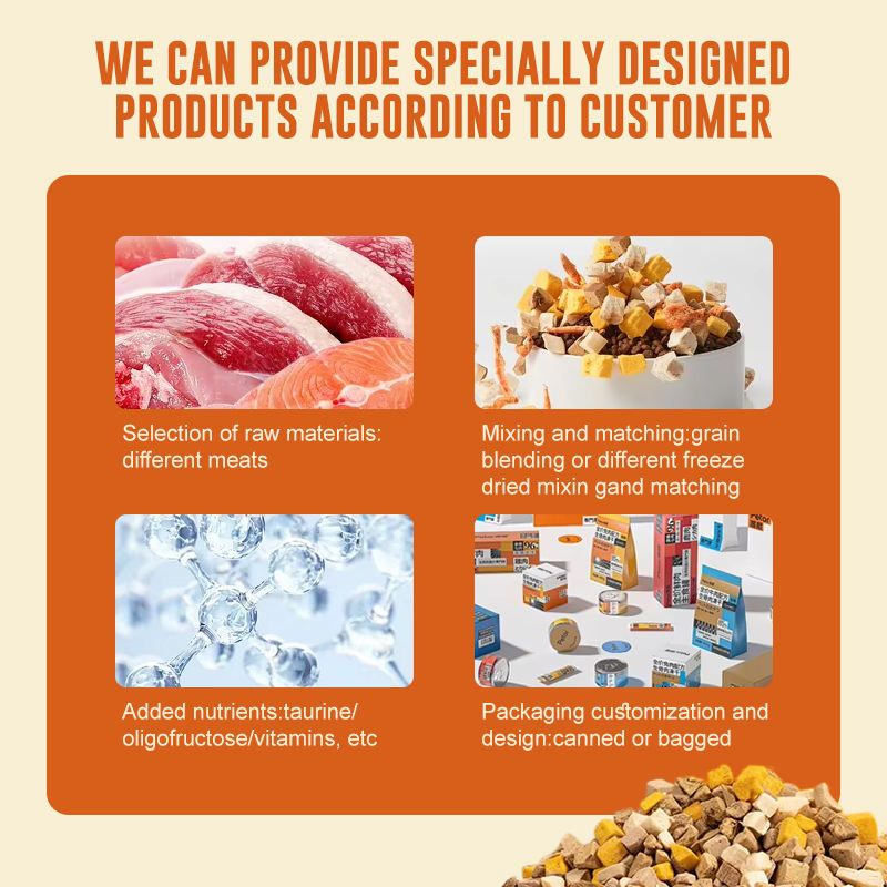 Friandises pour animaux de compagnie OEM ODM : Mélange de viande lyophilisée, protéines de qualité supérieure, sans céréales, favorisant un pelage brillant, friandises récompensantes pour chats et chiens