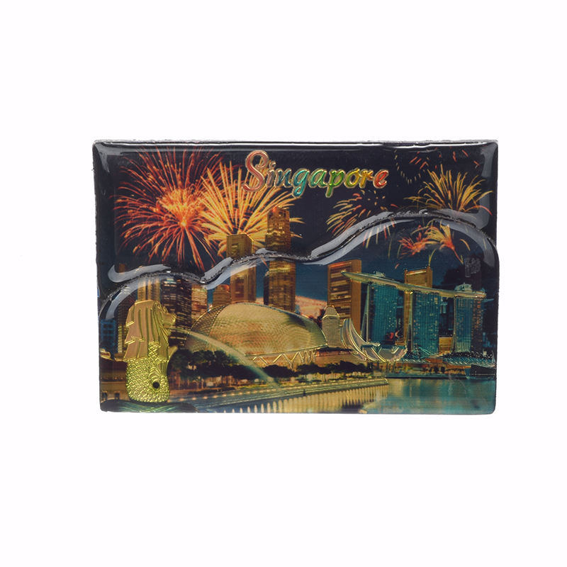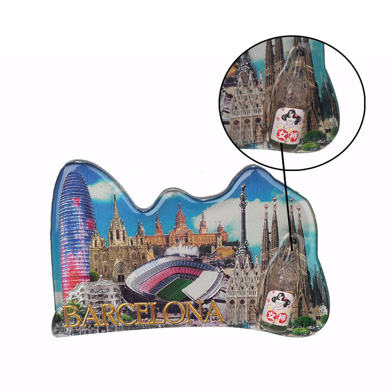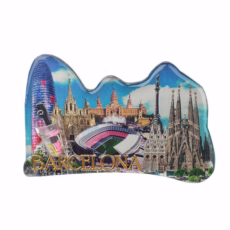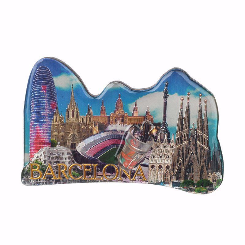 OEM/ODM Nouveau design d'artisanat de Barcelone Ville de voyage touristique de Singapour Bouteille de dérive de souvenir Aimant de réfrigérateur en époxy à double étage en feuille d'étain