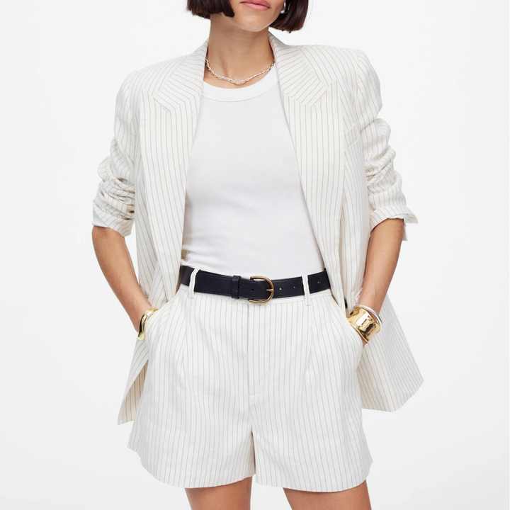 Ensemble de costume pour femme en lin uni élégant de style nouveau OEM/ODM, veste longue avec short, formel, pour le bureau, à rayures