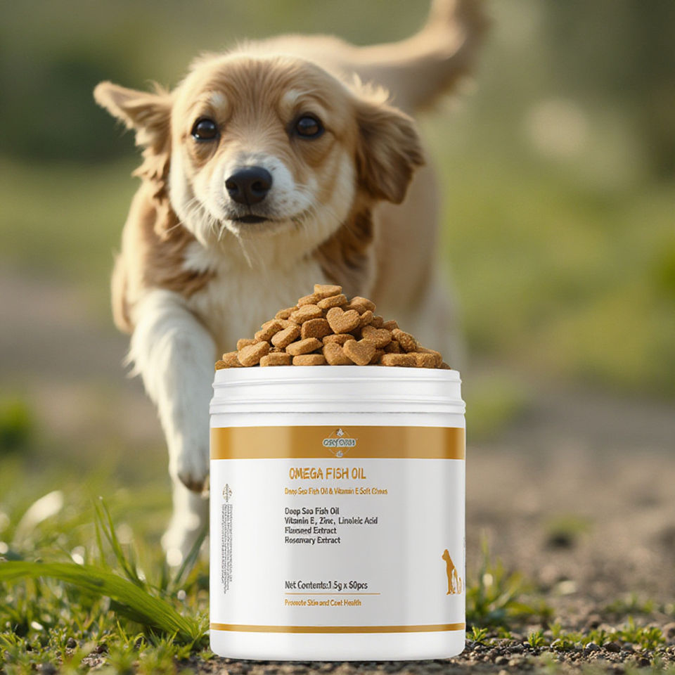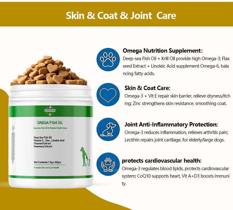Complément alimentaire en gummies à la vitamine E et à l'huile de poisson de saumon oméga 3 OEM ODM pour chats et chiens, soutien de la peau, du pelage, des articulations et du système immunitaire