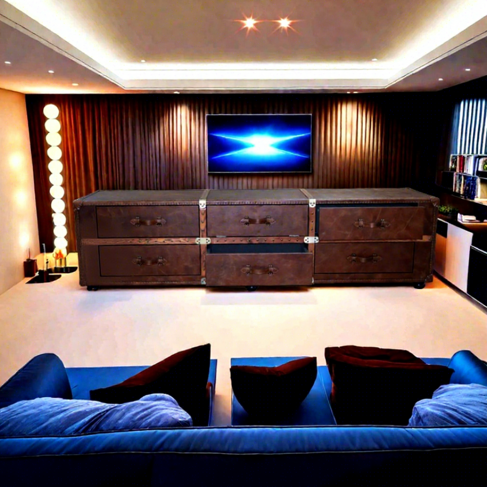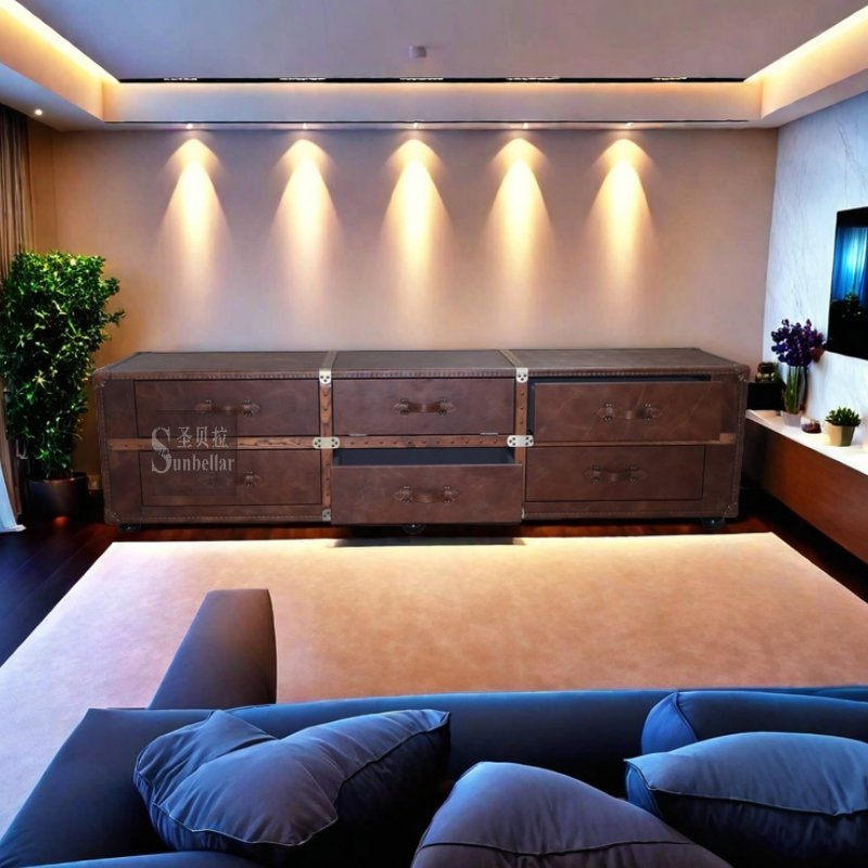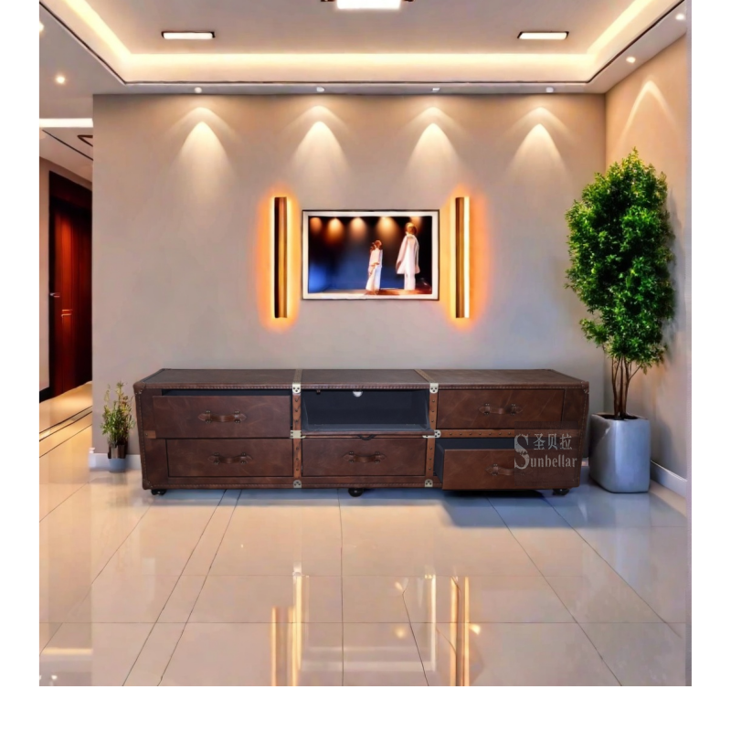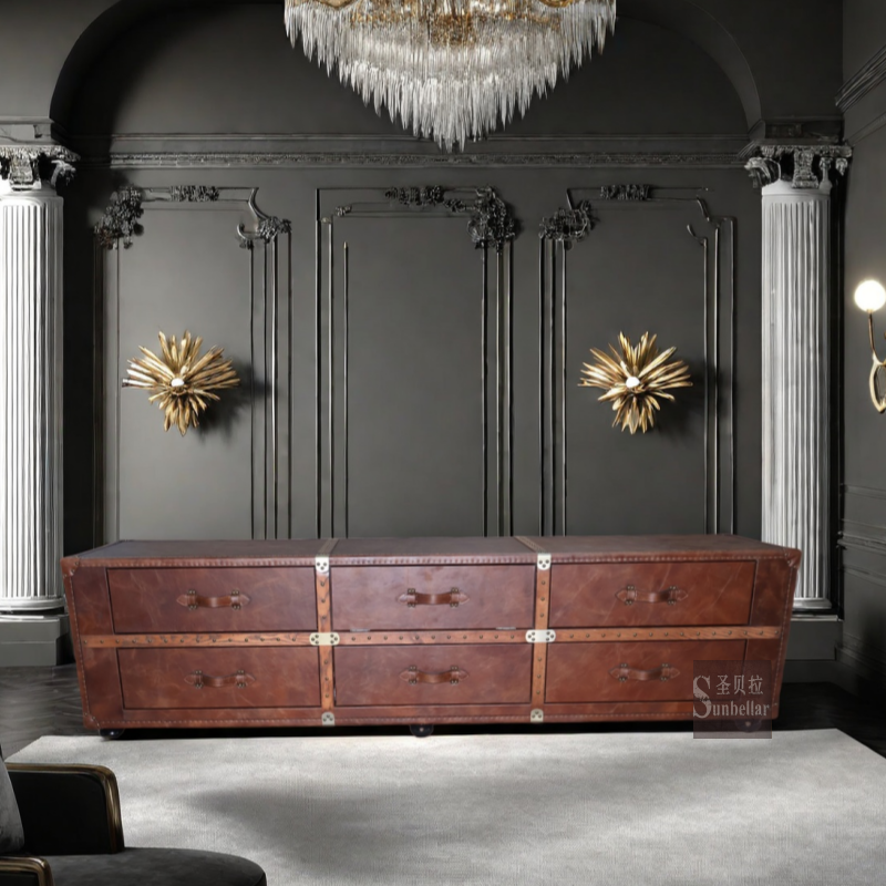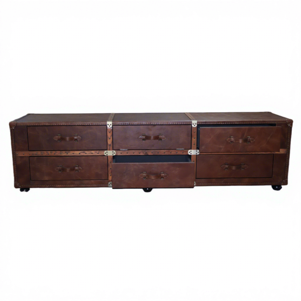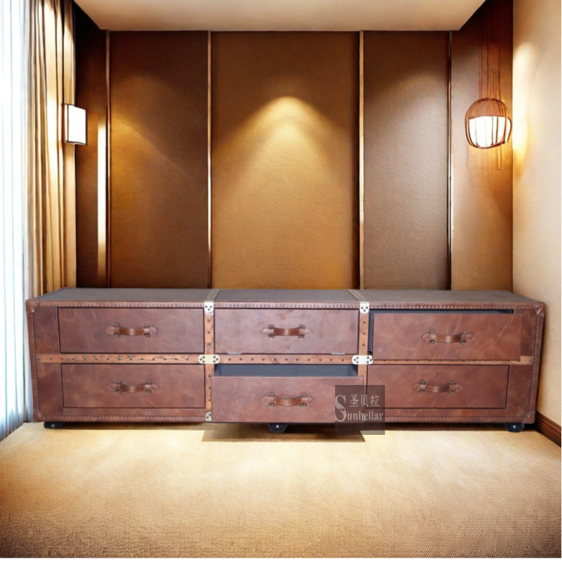Meuble TV en bois massif vintage rustique OEM ODM avec 6 tiroirs pour le salon, console multimédia avec revêtement en cuir véritable