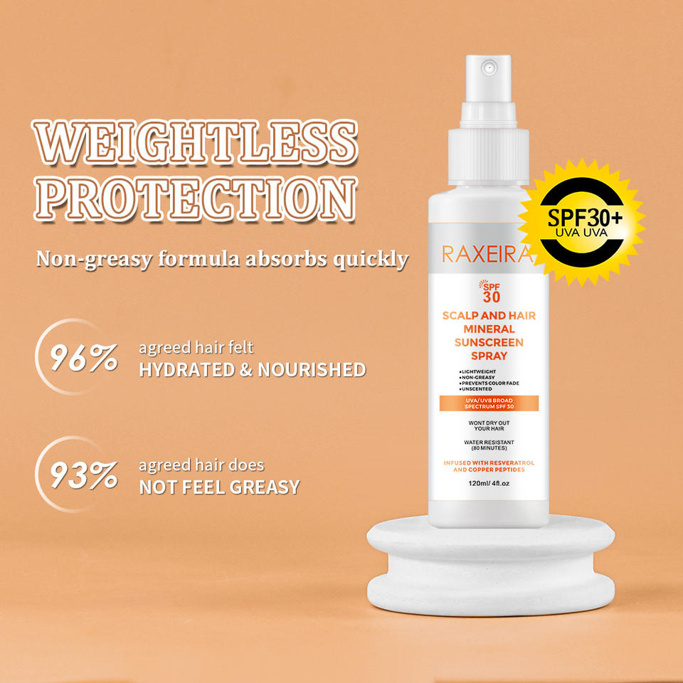 OEM/ODM Brume de protection solaire en spray organique SPF 30 Protection solaire pour le cuir chevelu Spray de protection solaire pour cheveux Marque privée Spray de protection solaire