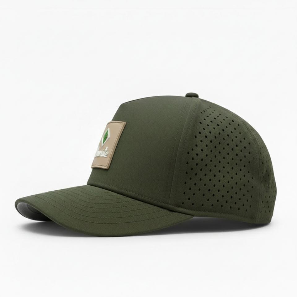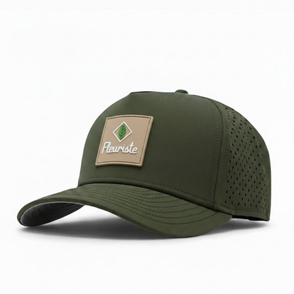Casquette de baseball structurée à 5 panneaux en caoutchouc personnalisée OEM, imperméable, à séchage rapide, respirante, pour sports de plein air, avec fermeture à pression