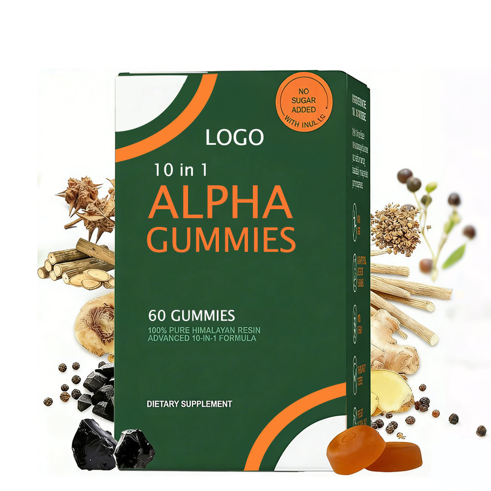 Complément alimentaire pour hommes, marque privée OEM, 10 en 1 Alpha Gummies avec Shilajit de l'Himalaya, Maca et Tongkat Ali