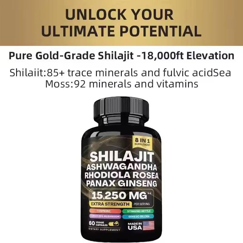 Capsules de Shilajit pur de l'Himalaya en marque privée OEM avec Ashwagandha, Ginseng, vitamines, complément énergétique 8 en 1